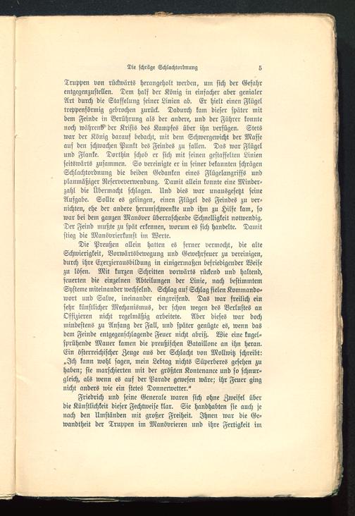 Truppen von rückwärts herangeholt werden, um sich der Gefahrentgegenzustellen. Dem half der König in einfacher aber genialerArt durch die Staffelung feiner Linien ab. Er hielt einen Flügeltreppenförmig gebrochen zurück. Dadurch kam dieser später mitdem Feinde in Berührung als der andere, und der Führer konntenoch während der Krisis des Kampfes über ihn verfügen. Stetswar der König darauf bedacht, mit dem Schwergewicht der Masseauf den schwachen Punkt des Feindes zu fallen. Das war Flügelund Flanke. Dorthin fchob er sich mit seinen gestaffelten Linienseitswärts zusammen. So vereinigte er in seiner bekannten schrägenSchlachtordnung die beiden Gedanken eines Flügelangriffs undplanmäßiger Reserveverwendung. Damit allein konnte eine Minder-zahl die Übermacht schlagen. Und dies war unausgesetzt seineAufgabe. Sollte es gelingen, einen Flügel des Feindes zu ver-nichten, ehe der andere herumschwenkte und ihm zu Hilfe kam, sowar bei dem ganzen Manöver überraschende Schnelligkeit notwendig.Der Feind mußte zu spät erkennen, worum es sich handelte. Damitstieg die Manövrierkunst im Werte.