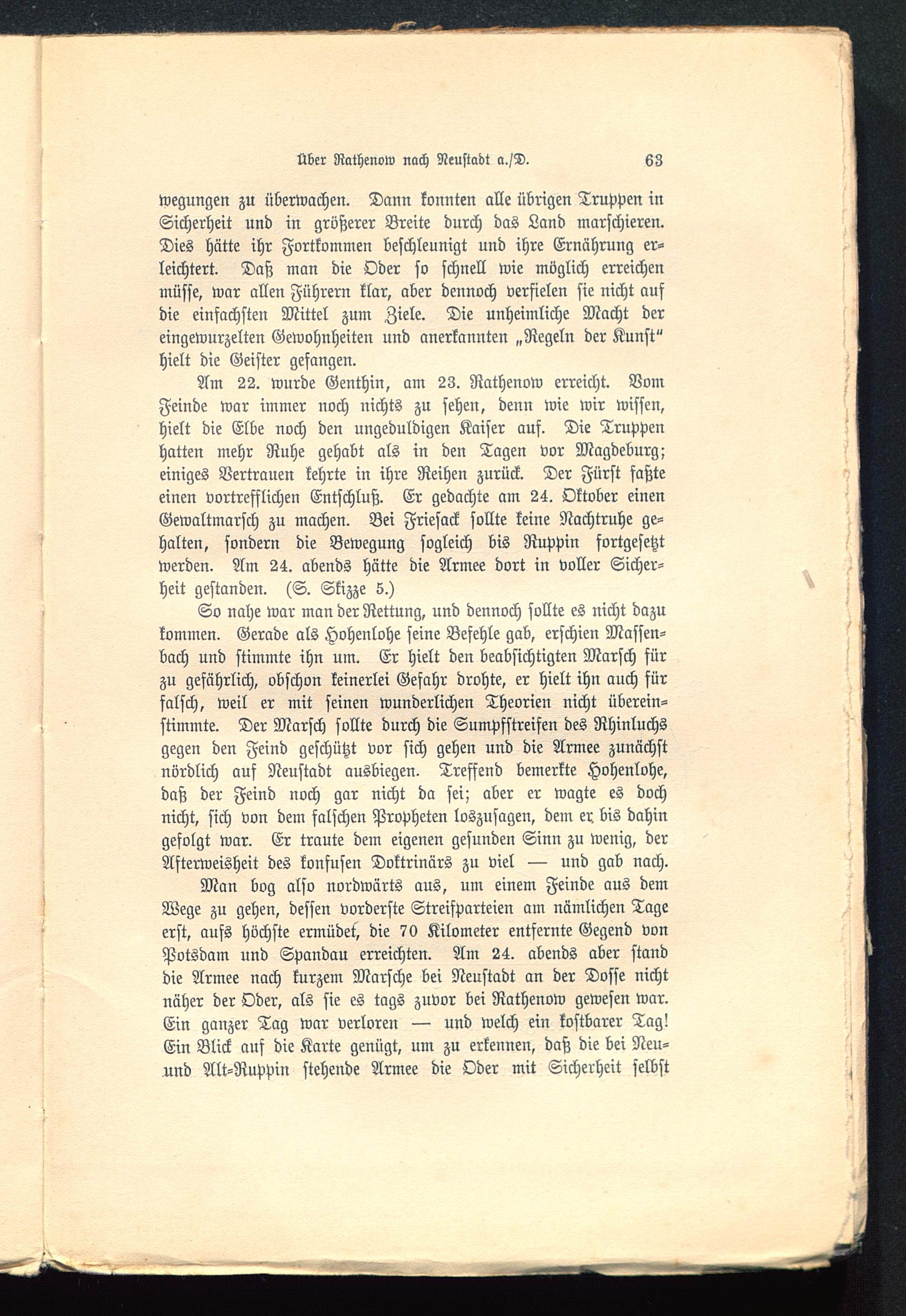 Man bog also nordwärts aus, um einem Feinde aus demWege zu gehen, dessen vorderste Streifparteien am nämlichen Tageerst, aufs höchste ermüdet, die 70 Kilometer entfernte Gegend vonPotsdam und Spandau erreichten. Am 24. abends aber standdie Armee nach kurzem Marsche bei Neustadt an der Dosse nichtnäher der Oder, als sie es tags zuvor bei Rathenow gewesen war.Ein ganzer Tag war verloren — und welch ein kostbarer Tag!Ein Blick auf die Karte genügt, um zu erkennen, daß die bei Neu-und Alt-Ruppin stehende Armee die Oder mit Sicherheit selbst