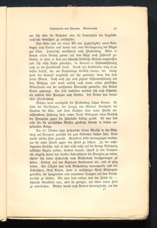 Das Ende war ein neuer Akt von Zaghaftigkeit, neues Aus-biegen nach Norden und damit eine neue Verlängerung des Wegeszur Oder. Hohenlohe marschierte nach Fürstenberg. Wäre erseinem ersten Vorsatz getreu auf dem Wege nach Zehdenick ge-blieben, so hätte er dort nur schwache feindliche Reiterei angetroffenund sich leicht Bahn gebrochen, da General v. Schimmelpfennignoch an der Havelbrücke stand. Durch sein Ausbleiben trug er zudessen Unfall, der am Nachmittage wirklich eintrat, bei. Langehatte der General vergeblich auf ihn gewartet; dann kam stattseiner Murat. Doch auch jetzt noch zögerte Schimmelpfennig mitden: Rückzüge und ward endlich nach einem ersten glücklichenWiderstande von der wachsenden Übermacht geworfen, sein kleinesKorps gesprengt. Ein Teil desselben wendete sich nach Schwedt ,ein anderer über Prenzlau nach Stettin . Die Armee war fortanohne Flankenschutz.