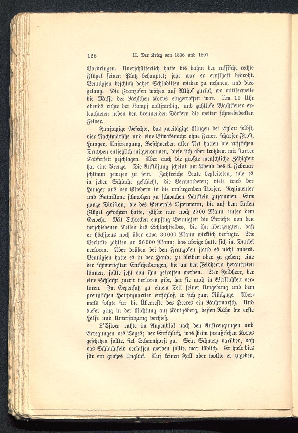 Fünftägige Gefechte, das zweitägige Ringen bei Eylau selbst,vier Nachtmärsche und eine Biwaksnacht ohne Feuer, scharfer Frost,Hunger, Anstrengung, Beschwerden aller Art hatten die russischenTruppen entsetzlich mitgenommen, diese sich aber trotzdem mit starrerTapferkeit geschlagen. Aber auch die größte menschliche Zähigkeithat eine Grenze. Die Auflösung scheint am Abend des 3. Februarschlimm gewesen zu sein. Zahlreiche Leute begleiteten, wie esin jeder Schlacht geschieht, die Verwundeten; viele trieb derHuuger aus den Gliedern in die umliegenden Dörfer. Regimenterund Bataillone schmolzen zu schwachen Häuflein zusammen. Eineganze Division, die des Generals Ostermann, die auf dem linkenFlügel gefochten hatte, zählte nur noch 2700 Mann unter demGewehr. Mit Schrecken empfing Bennigsen die Berichte von denverschiedenen Teilen des Schlachtfeldes, die ihn überzeugten, daßer höchsteus noch über etwa 30000 Mann wirklich verfügte. DieVerluste zählten an 26000 Mann; das übrige hatte sich im Dunkelverloren. Aber drüben bei den Franzosen stand es nicht anders.Bennigsen hatte es in der Hand, zu bleiben oder zu gehen; eineder schwierigsten Entscheidungen, die an den Feldherrn herantretenkönnen, sollte jetzt von ihm getroffen werden. Der Feldherr, dereine Schlacht zuerst verloren gibt, hat sie auch in Wirklichkeit ver-loren. Im Gegensatz zu einem Teil seiner Umgebung und dempreußischen Hauptquartier entschloß er sich zum Rückzüge. Aber-mals folgte für die Überreste des Heeres ein Nachtmarsch. Unddieser ging in der Richtung auf Königsberg, dessen Nähe die ersteHilfe und Unterstützung verhieß.