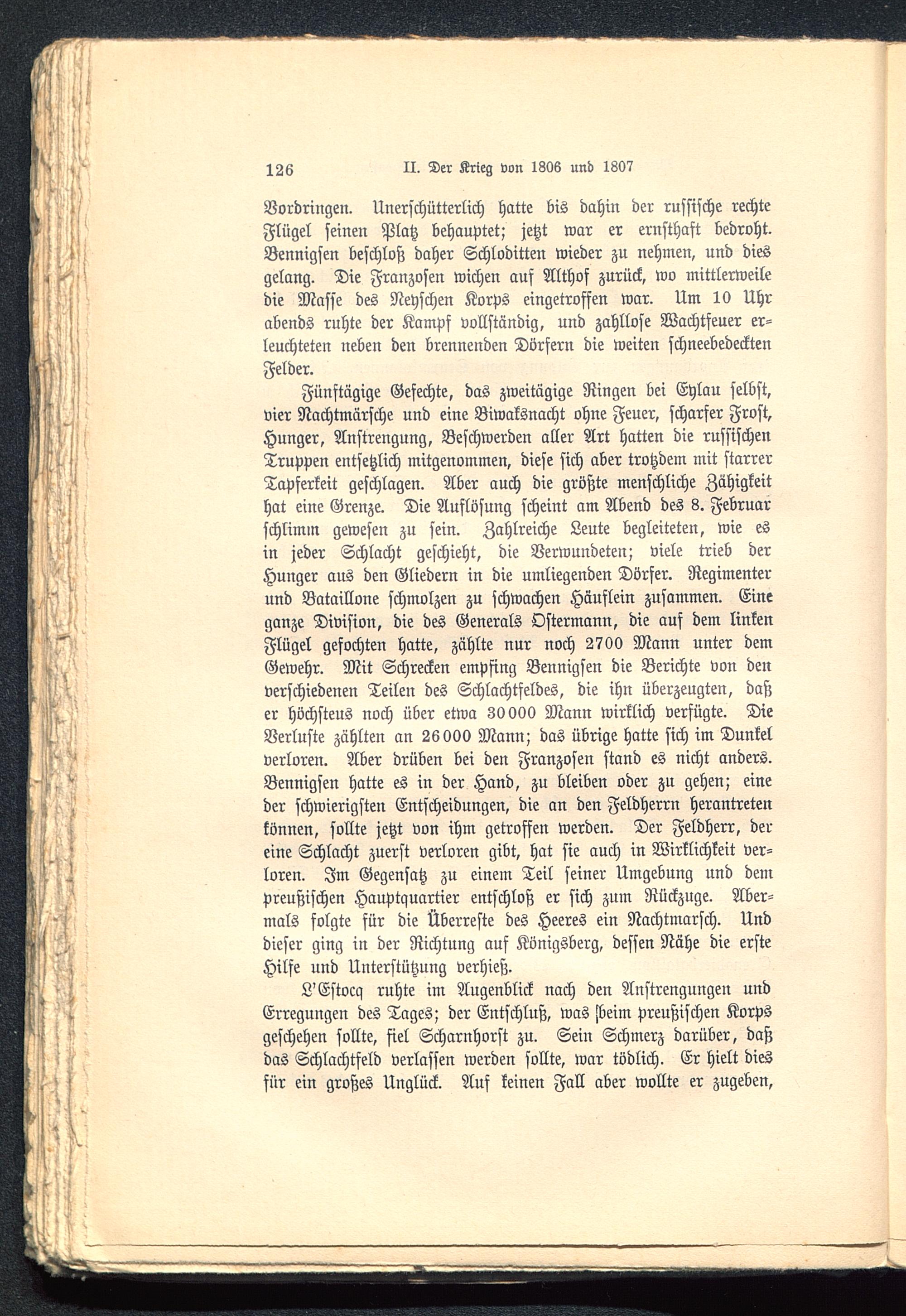 L'Estocq ruhte im Augenblick nach den Anstrengungen undErregungen des Tages; der Entschluß, was steim preußischen Korpsgeschehen sollte, fiel Scharnhorst zu. Sein Schmerz darüber, daßdas Schlachtfeld verlassen werden sollte, war tödlich. Er hielt diesfür ein großes Unglück. Auf keinen Fall aber wollte er zugeben,