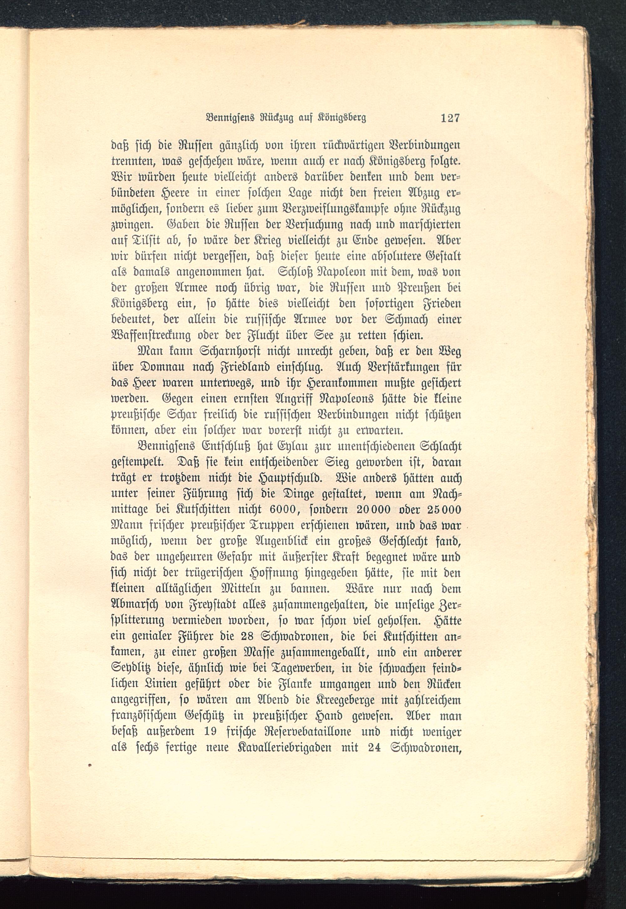 Bennigsens Entschluß hat Eylau zur unentschiedenen Schlachtgestempelt. Daß sie kein entscheidender Sieg geworden ist, daranträgt er trotzdem nicht die Hauptschuld. Wie anders hätten auchunter seiner Führung sich die Dinge gestaltet, wenn am Nach-mittage bei Kutschitten nicht 6000, sondern 20 000 oder 25000Mann frischer preußischer Truppen erschienen wären, und das warmöglich, wenn der große Augenblick ein großes Geschlecht fand,das der ungeheuren Gefahr mit äußerster Kraft begegnet wäre undsich nicht der trügerischen Hoffnung hingegeben hätte, sie mit denkleinen alltäglichen Mitteln zu bannen. Wäre nur nach demAbmarsch von Freystadt alles zusammengehalten, die unselige Zer-splitterung vermieden worden, so war schon viel geholfen. Hätteein genialer Führer die 28 Schwadronen, die bei Kutschitten an-kamen, zu einer großen Masse zusammengeballt, und ein andererSeydlitz diese, ähnlich wie bei Tagewerken, in die schwachen feind-lichen Linien geführt oder die Flanke umgangen und den Rückenangegriffen, so wären am Abend die Kreegeberge mit zahlreichemfranzösischem Geschütz in preußischer Hand gewesen. Aber manbesaß außerdem 19 frische Reservebataillone und nicht wenigerals sechs fertige neue Kavalleriebrigaden mit 24 Schwadronen,