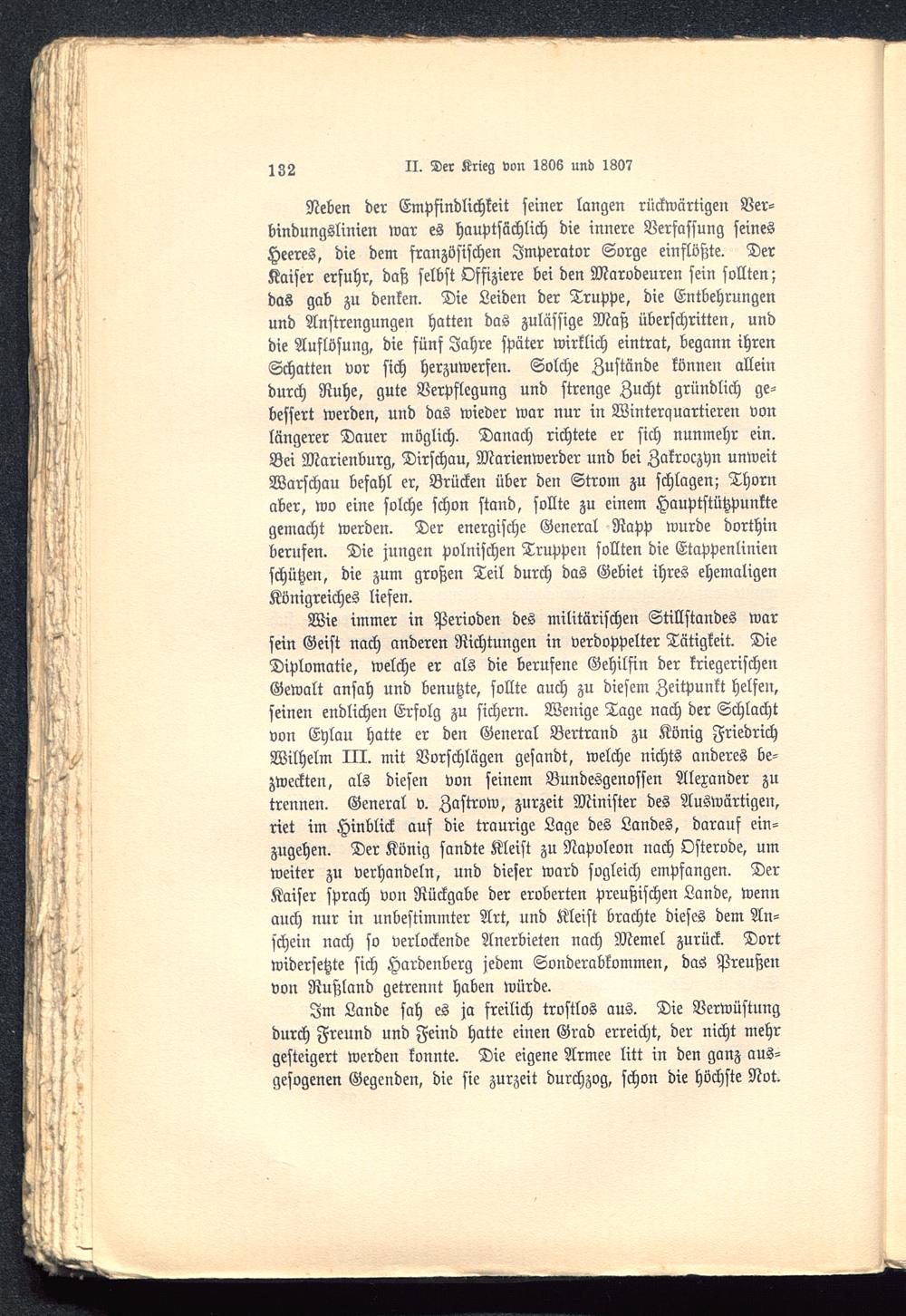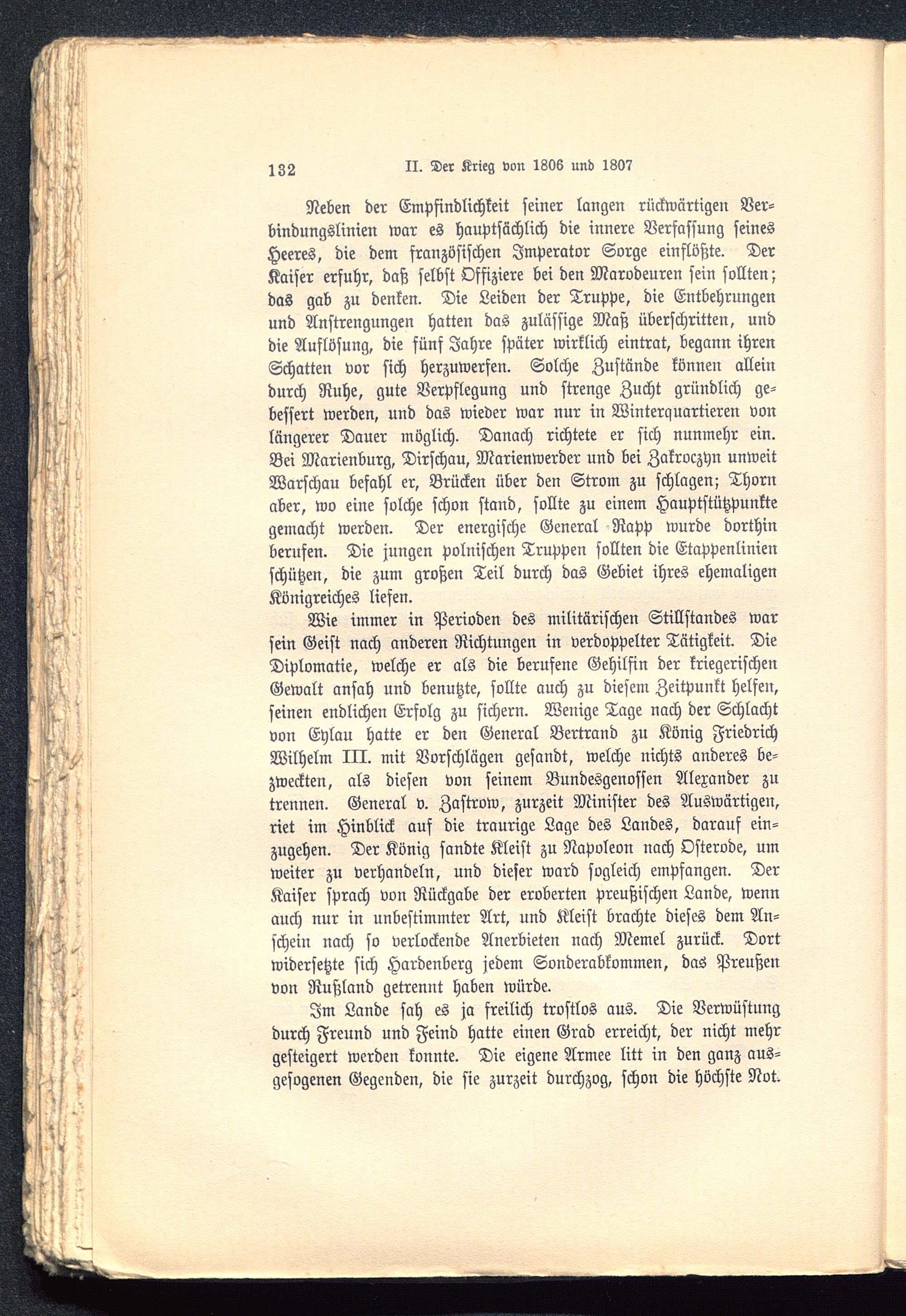 Wie immer in Perioden des militärischen Stillstandes warsein Geist nach anderen Richtungen in verdoppelter Tätigkeit. DieDiplomatie, welche er als die berufene Gehilfin der kriegerischenGewalt ansah und benutzte, sollte auch zu diesem Zeitpunkt helfen,seinen endlichen Erfolg zu sichern. Wenige Tage nach der Schlachtvon Eylau hatte er den General Bertrand zu König FriedrichWilhelm III. mit Vorschlägen gesandt, welche nichts anderes be-zweckten, als diesen von seinem Bundesgenossen Alexander zutrennen. General v. Zastrow, zurzeit Minister des Auswärtigen,riet im Hinblick auf die traurige Lage des Landes, darauf ein-zugehen. Der König sandte Kleist zu Napoleon nach Osterode , umweiter zu verhandeln, und dieser ward sogleich empfangen. DerKaiser sprach von Rückgabe der eroberten preußischen Lande, wennauch nur in unbestimmter Art, und Kleist brachte dieses dem An-schein nach so verlockende Anerbieten nach Memel zurück. Dortwidersetzte sich Hardenberg jedem Sonderabkommen, das Preußenvon Rußland getrennt haben würde.