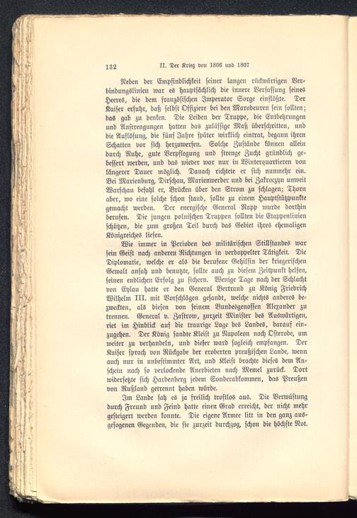 Neben der Empfindlichkeit seiner langen rückwärtigen Ver-bindungslinien war es hauptsächlich die innere Verfassung seinesHeeres, die dem französischen Imperator Sorge einflößte. DerKaiser erfuhr, daß selbst Offiziere bei den Marodeuren sein sollten;das gab zu denken. Die Leiden der Truppe, die Entbehrungenund Anstrengungen hatten das zulässige Maß überschritten, unddie Auflösung, die fünf Jahre später wirklich eintrat, begann ihrenSchatten vor sich herzuwerfen. Solche Zustände können alleindurch Ruhe, gute Verpflegung und strenge Zucht gründlich ge-bessert werden, und das wieder war nur in Winterquartieren vonlängerer Dauer möglich. Danach richtete er sich nunmehr ein.Bei Marienburg, Dirschau , Marienwerder und bei Zakroczyn unweitWarschau befahl er, Brücken über den Strom zu schlagen; Thornaber, wo eine solche schon stand, sollte zu einem Hauptstützpunktegemacht werden. Der energische General Rapp wurde dorthinberufen. Die jungen polnischen Truppen sollten die Etappenlinienschützen, die zum großen Teil durch das Gebiet ihres ehemaligenKönigreiches liefen.