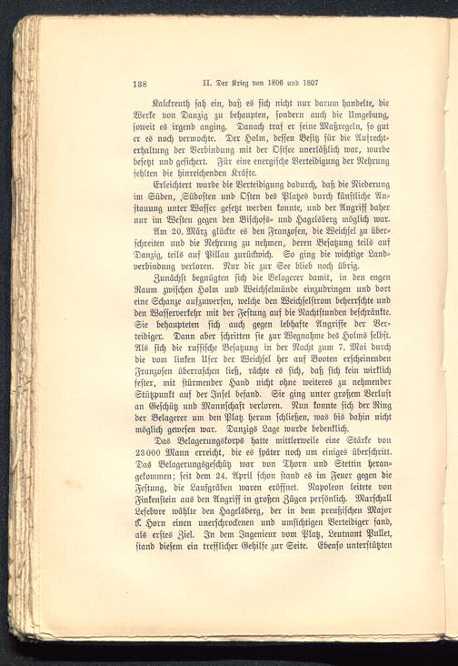 Das Belagerungskorps hatte mittlerweile eine Stärke von23 000 Mann erreicht, die es später noch um einiges überschritt.Das Belagerungsgeschütz war von Thorn und Stettin heran-gekommen; seit dem 24. April schon stand es im Feuer gegen dieFestung, die Laufgräben waren eröffnet. Napoleon leitete vonFinkenstein aus den Angriff in großen Zügen persönlich. MarschallLefebvre wählte den Hagelsberg, der in dem preußischen MajorHorn einen unerschrockenen und umsichtigen Verteidiger fand,als erstes Ziel. In dem Ingenieur vom Platz, Leutnant Pullet,stand diesem ein trefflicher Gehilfe zur Seite. Ebenso unterstützten