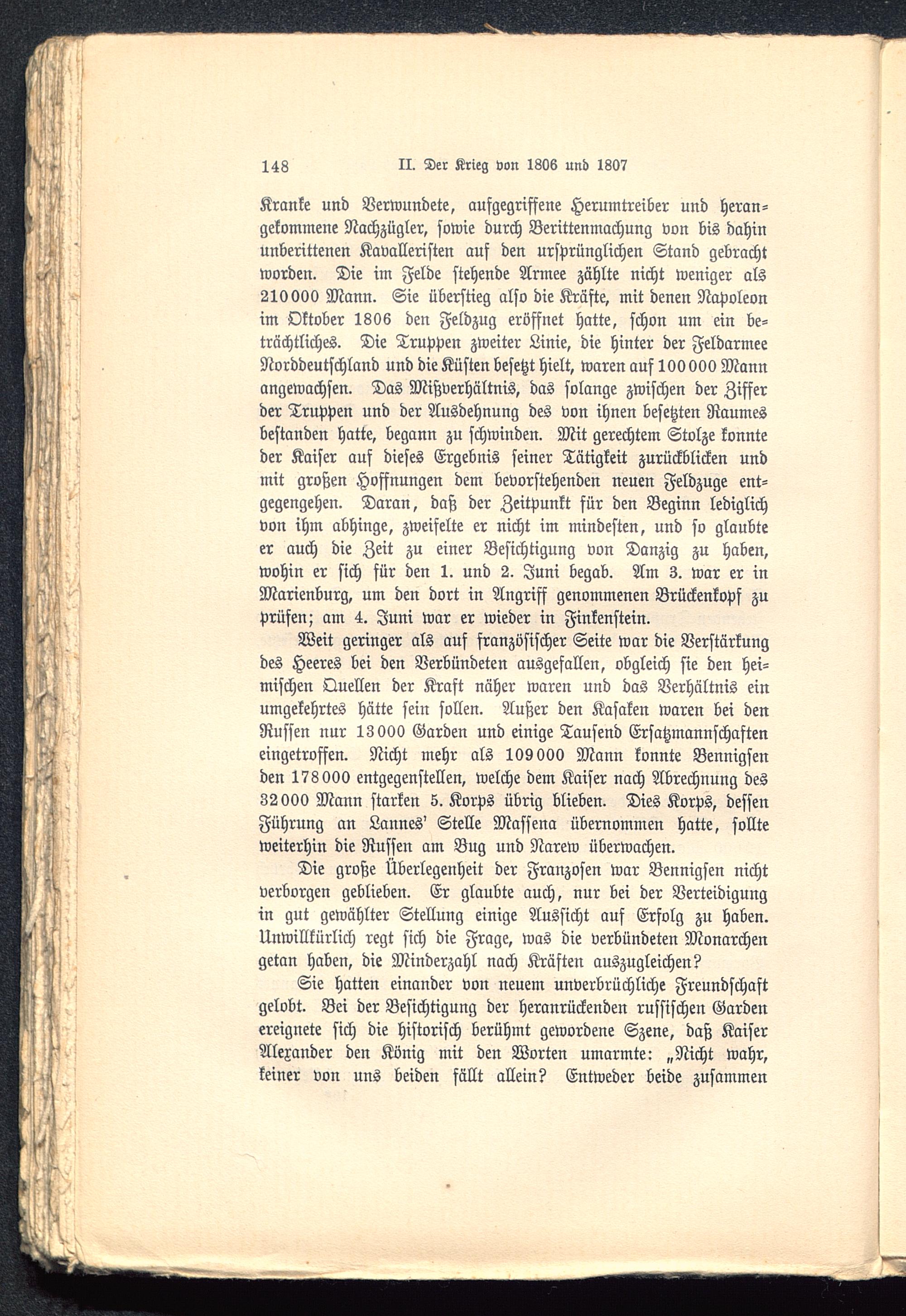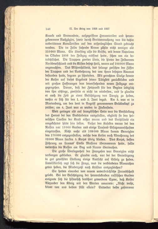 Kranke und Verwundete, aufgegriffene Herumtreiber und heran-gekommen? Nachzügler, sowie durch Berittenmachung von bis dahinunberittenen Kavalleristen auf den ursprünglichen Stand gebrachtworden. Die im Felde stehende Armee zählte nicht weniger als210000 Mann. Sie überstieg also die Kräfte, mit denen Napoleon im Oktober 1806 den Feldzug eröffnet hatte, schon um ein be-trächtliches. Die Truppen zweiter Linie, die hinter der FeldarmeeNorddeutschland und die Küsten besetzt hielt, waren auf 100 000 Mannangewachsen. Das Mißverhältnis, das solange zwischen der Zifferder Truppen und der Ausdehnung des von ihnen besetzten Raumesbestanden hatte, begann zu schwinden. Mit gerechtem Stolze konnteder Kaiser auf dieses Ergebnis seiner Tätigkeit zurückblicken undmit großen Hoffnungen dem bevorstehenden neuen Feldzuge ent-gegengehen. Daran, daß der Zeitpunkt für den Beginn lediglichvon ihm abhinge, zweifelte er nicht im mindesten, und so glaubteer auch die Zeit zu einer Besichtigung von Danzig zu haben,wohin er sich für den 1. und 2. Juni begab. Am 3. war er inMarienburg, um den dort in Angriff genommenen Brückenkopf zuprüfen; am 4. Juni war er wieder in Finkenstein .