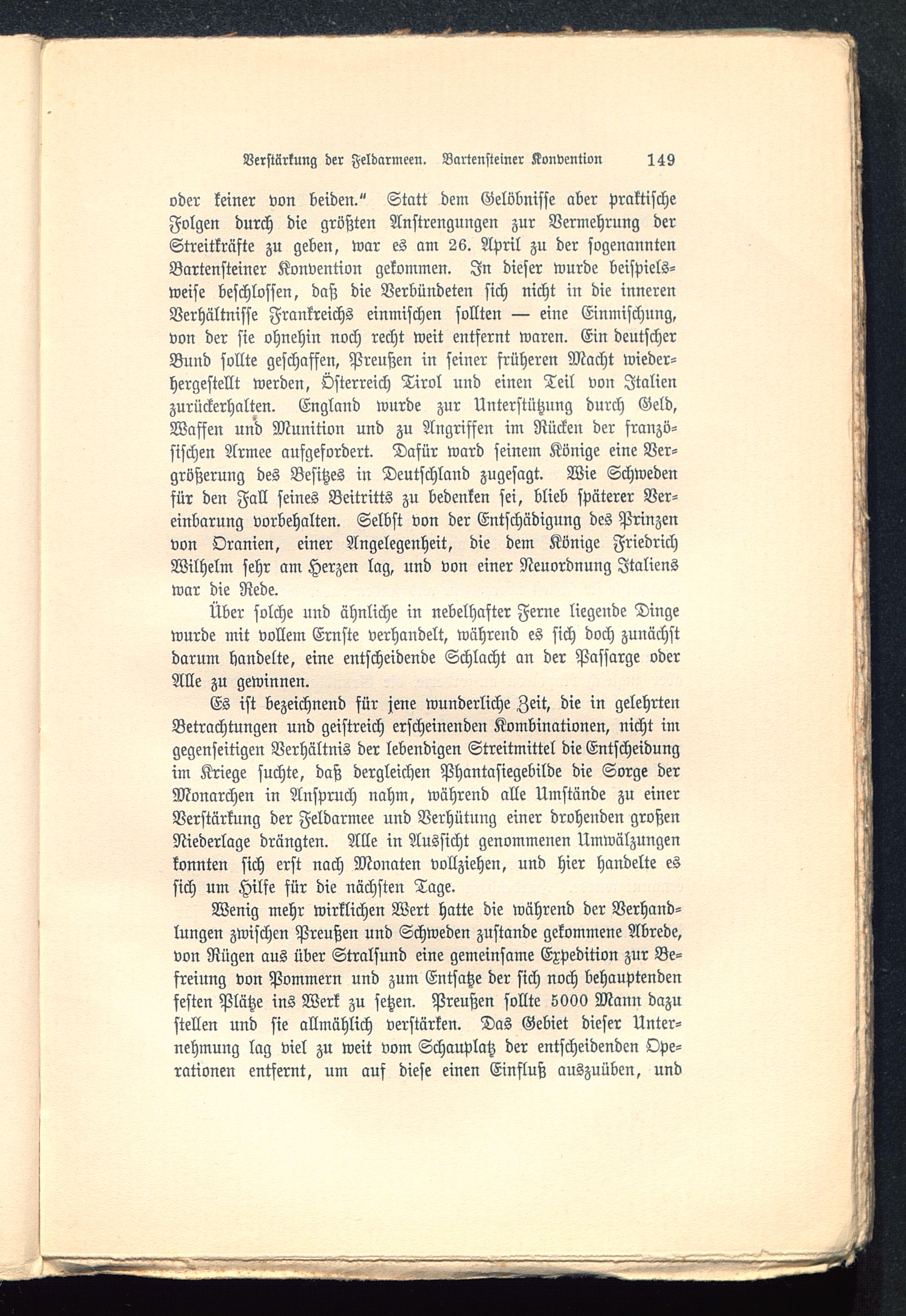 oder keiner von beiden." Statt dem Gelöbnisse aber praktischeFolgen durch die größten Anstrengungen zur Vermehrung derStreitkräfte zu geben, war es am 26. Zlpril zu der sogenanntenBartensteiner Konvention gekommen. In dieser wurde beispiels-weise beschlossen, daß die Verbündeten sich nicht in die innerenVerhältnisse Frankreichs einmischen sollten — eine Einmischung,von der sie ohnehin noch recht weit entfernt waren. Ein deutscherBund sollte geschaffen, Preußen in seiner früheren Macht wieder-hergestellt werden, Österreich Tirol und einen Teil von Italien zurückerhalten. England wurde zur Unterstützung durch Geld,Waffen und Munition und zu Angriffen im Rücken der franzö-sischen Armee aufgefordert. Dafür ward seinem Könige eine Ver-größerung des Besitzes in Deutschland zugesagt. Wie Schweden für den Fall seines Beitritts zu bedenken sei, blieb späterer Ver-einbarung vorbehalten. Selbst von der Entschädigung des Prinzenvon Oranien, einer Angelegenheit, die dem Könige FriedrichWilhelm sehr am Herzen lag, und von einer Neuordnung Italiens war die Rede.
