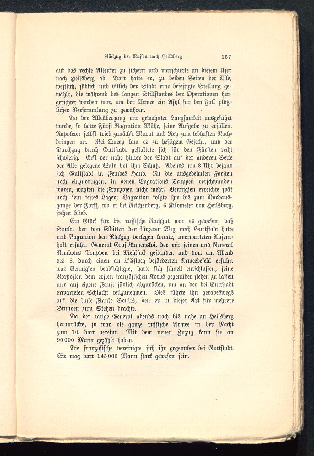 Da der tätige General abends noch bis nahe an Heilsbergheranrückte, so war die ganze russische Armee in der Nachtzum 10. dort vereint. Mit dem neuen Zuzug kann sie an90000 Mann gezählt haben.