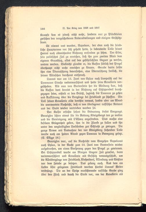Es nimmt uns wunder, Napoleon , der eben noch die feind-liche Hauptarmee vor sich gehabt hatte, so bedeutende Teile seinesHeeres nach abweichender Richtung entsenden zu sehen. Der Eifer,sein politisches Ziel zu erreichen, ließ ihn zum zweiten Male demeigenen Grundsatz, alles auf den gefährlichsten Gegner zu werfen,untreu werden. Vielleicht glaubte er, die Russen südlich des Pregel überhaupt nicht mehr erreichen zu können. Gerade darin sollteihm eine Überraschung bevorstehen, eine Überraschung freilich, dieseinen Wünschen durchaus entsprach.