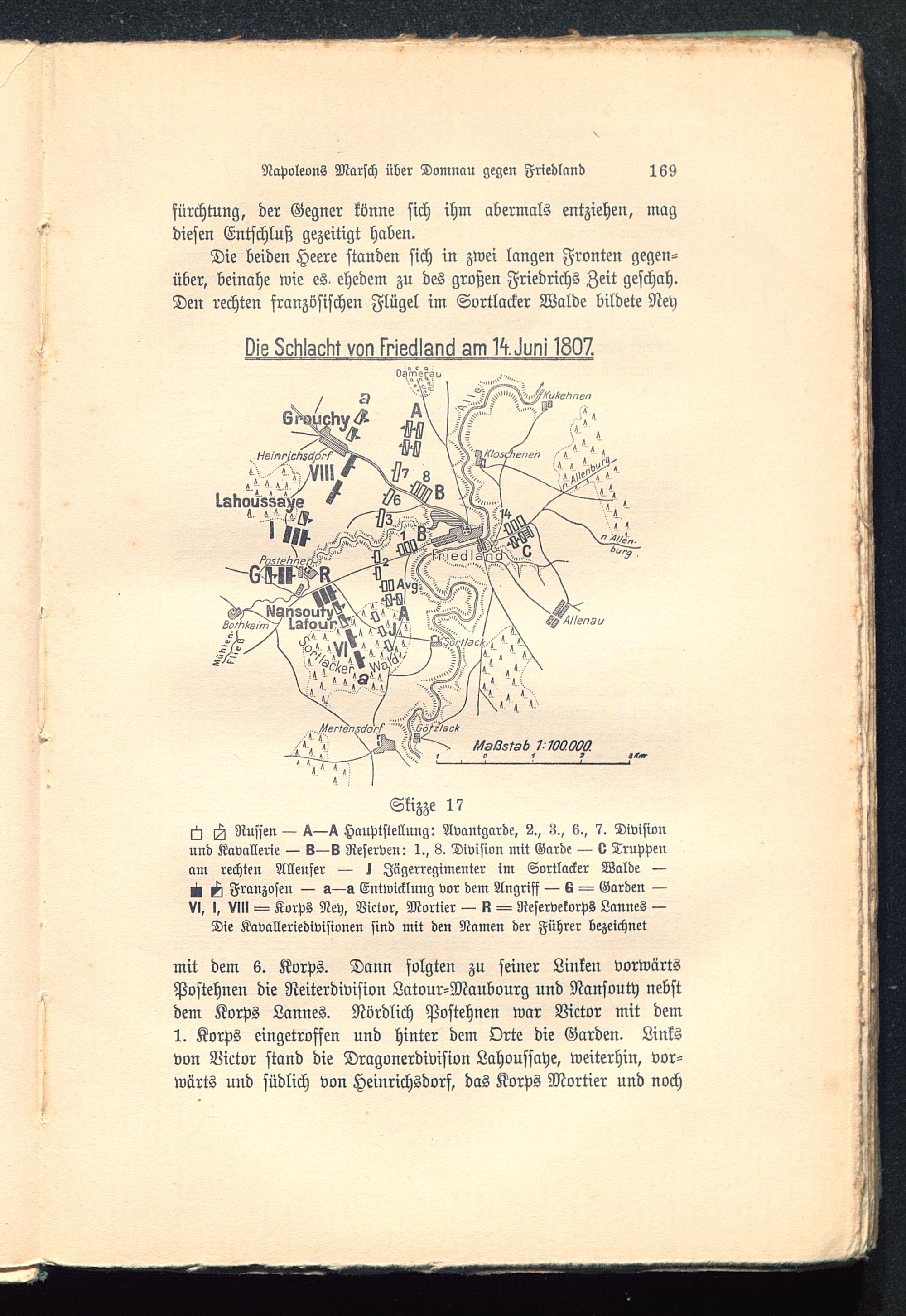 ^ H Russen — 4 Hauptstellung: Avantgarde, 2., 3., k., 7. Divisionund Kavallerie — S—v Reserven: 1., 8. Division mit Garde — v Truppenam rechten Alleufer — j Jägerregimenter im Sortlacker Walde —^1 H Franzosen — a—s Entwicklung vor dem Angriff — K — Garden —VI, I, VIII Korps Ney, Victor, Mortier — N ^ Reservekorps Lannes —Die Kavalleriedtvisionen sind mit den Namen der Führer bezeichnet