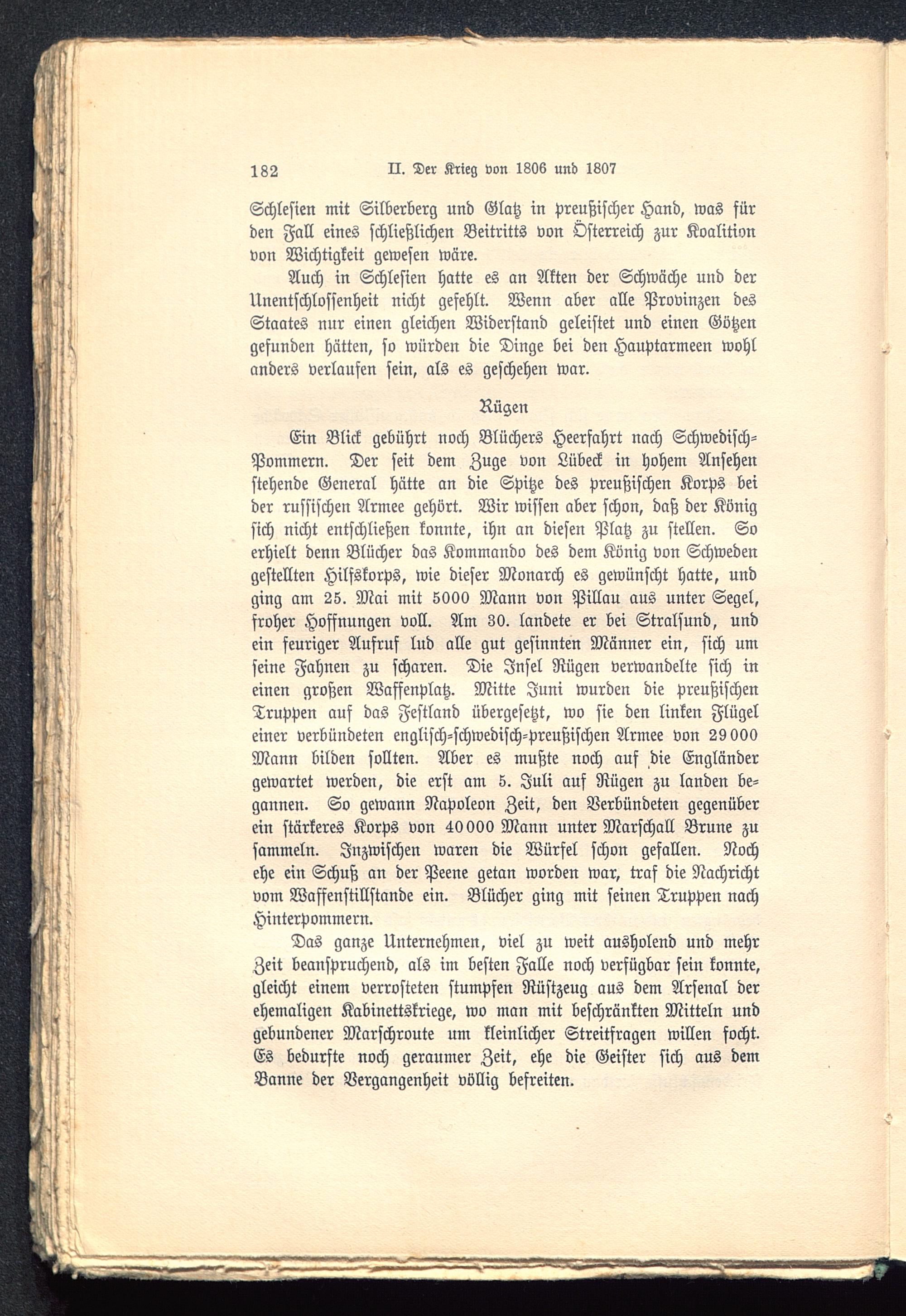 Ein Blick gebührt noch Blüchers Heerfahrt nach Schwedisch-Pommern. Der seit dem Zuge von Lübeck in hohem Ansehenstehende General hätte an die Spitze des preußischen Korps beider russischen Armee gehört. Wir wissen aber schon, daß der Königsich nicht entschließen konnte, ihn an diesen Platz zu stellen. Soerhielt denn Blücher das Kommando des dem König von Schweden gestellten Hilfskorps, wie dieser Monarch es gewünscht hatte, undging am 25. Mai mit 5000 Mann von Pillau aus unter Segel,froher Hoffnungen voll. Am 30. landete er bei Stralsund , undein feuriger Aufruf lud alle gut gesinnten Männer ein, sich umseine Fahnen zu scharen. Die Insel Rügen verwandelte sich ineinen großen Waffenplatz. Mitte Juni wurden die preußischenTruppen auf das Festland übergesetzt, wo sie den linken Flügeleiner verbündeten englisch-schwedisch -preußischen Armee von 29 000Mann bilden sollten. Aber es mußte noch auf die Engländergewartet werden, die erst am 5. Juli auf Rügen zu landen be-gannen. So gewann Napoleon Zeit, den Verbündeten gegenüberein stärkeres Korps von 40000 Mann unter Marschall Brune zusammeln. Inzwischen waren die Würfel schon gefallen. Nochehe ein Schuß an der Peene getan worden war, traf die Nachrichtvom Waffenstillstände ein. Blücher ging mit seinen Truppen nachHinterPommern.