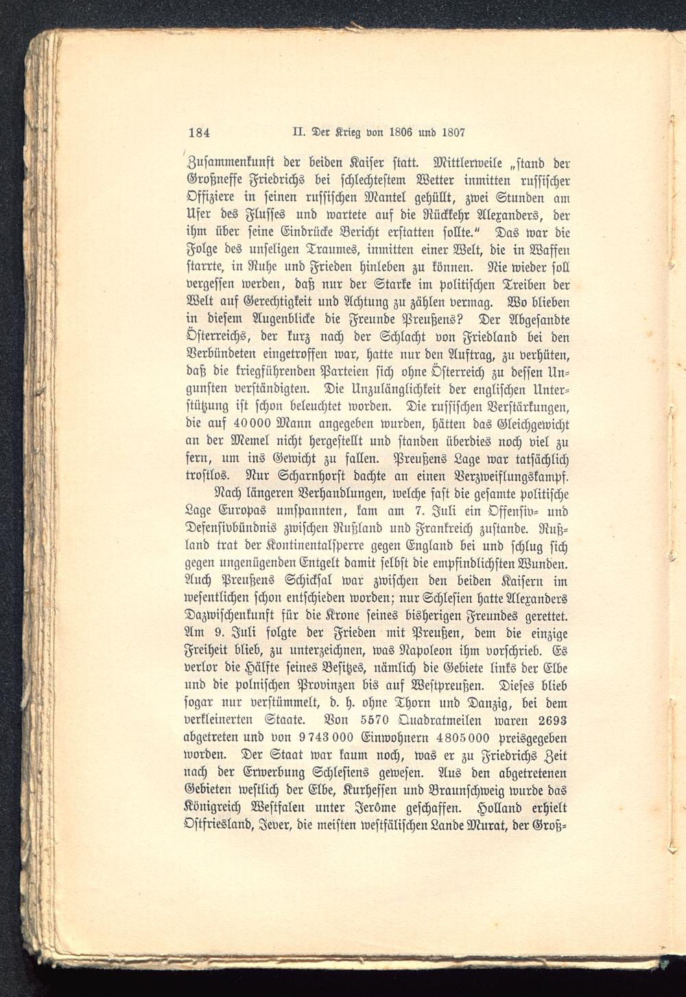 Nach längeren Verhandlungen, welche fast die gesamte politischeLage Europas umspannten, kam am 7. Juli ein Offensiv- undDefensivbündnis zwischen Rußland und Frankreich zustande. Ruß-land trat der Kontinentalsperre gegen England bei und schlug sichgegen ungenügenden Entgelt damit selbst die empfindlichsten Wunden.Auch Preußens Schicksal war zwischen den beiden Kaisern imwesentlichen schon entschieden worden; nur Schlesien hatte AlexandersDazwischenkunft für die Krone seines bisherigen Freundes gerettet.Am 9. Juli folgte der Frieden mit Preußen, dem die einzigeFreiheit blieb, zu unterzeichnen, was Napoleon ihm vorschrieb. Esverlor die Hälfte seines Besitzes, nämlich die Gebiete links der Elbe und die polnischen Provinzen bis auf Westpreußen . Dieses bliebsogar nur verstümmelt, d. h. ohne Thorn und Danzig , bei demverkleinerten Staate. Von 5570 Quadratmeilen waren 2693abgetreten und von 9 743 000 Einwohnern 4305 000 preisgegebenworden. Der Staat war kaum noch, was er zu Friedrichs Zeituach der Erwerbung Schlesiens gewesen. Aus den abgetretenenGebieten westlich der Elbe, Kurhessen und Braunschweig wurde dasKönigreich Westfalen unter Jerüme geschaffen. Holland erhieltOstfriesland, Jever , die meisten westfälischen Lande Murat, der Groß-