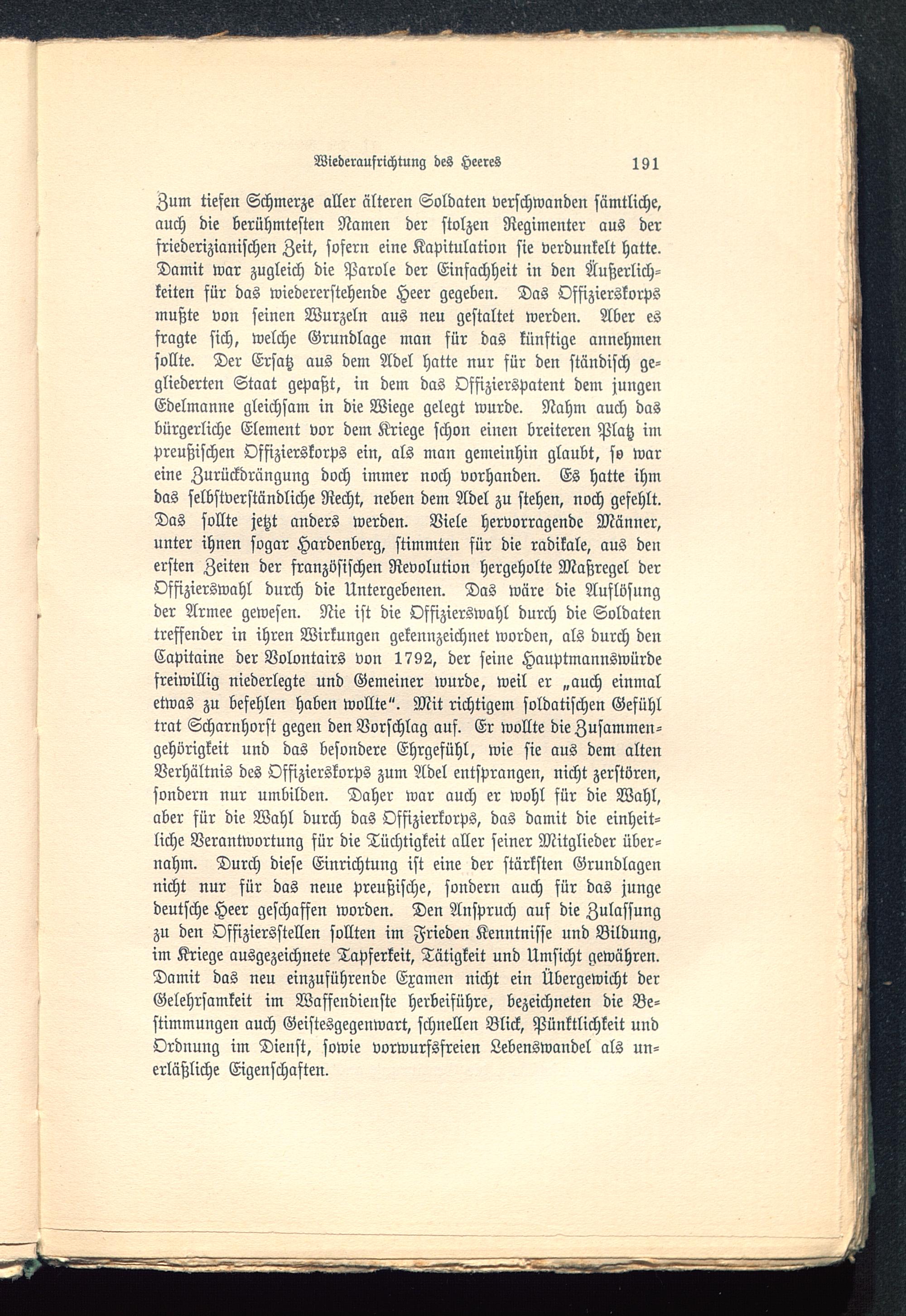 Zum tiefen Schmerze aller älteren Soldaten verschwanden sämtliche,auch die berühmtesten Namen der stolzen Regimenter aus derfriederizianischen Zeit, sofern eine Kapitulation sie verdunkelt hatte.Damit war zugleich die Parole der Einfachheit in den Äußerlich-keiten für das wiedererstehende Heer gegeben. Das Offizierskorpsmußte von seinen Wurzeln aus neu gestaltet werden. Aber esfragte sich, welche Grundlage man für das künftige annehmensollte. Der Ersatz aus dem Adel hatte nur für den ständisch ge-gliederten Staat gepaßt, in dem das Offizierspatent dem jungenEdelmanns gleichsam in die Wiege gelegt wurde. Nahm auch dasbürgerliche Element vor dem Kriege schon einen breiteren Platz impreußischen Offizierskorps ein, als man gemeinhin glaubt, so wareine Zurückdrängung doch immer noch vorhanden. Es hatte ihmdas selbstverständliche Recht, neben dem Adel zu stehen, noch gefehlt.Das sollte jetzt anders werden. Viele hervorragende Männer,unter ihnen sogar Hardenberg, stimmten für die radikale, aus denersten Zeiten der französischen Revolution hergeholte Maßregel derOffizierswahl durch die Untergebenen. Das wäre die Auflösungder Armee gewesen. Nie ist die Offizierswahl durch die Soldatentreffender in ihren Wirkungen gekennzeichnet worden, als durch denCapitaine der Volontairs von 1792, der seine Hauptmannswürdefreiwillig niederlegte und Gemeiner wurde, weil er „auch einmaletwas zu befehlen haben wollte". Mit richtigem soldatischen Gefühltrat Scharnhorst gegen den Vorschlag auf. Er wollte die Zusammen-gehörigkeit und das besondere Ehrgefühl, wie sie aus dem altenVerhältnis des Offizierskorps zum Adel entsprangen, nicht zerstören,sondern nur umbilden. Daher war auch er wohl für die Wahl,aber für die Wahl durch das Offizierkorps, das damit die einheit-liche Verantwortung für die Tüchtigkeit aller seiner Mitglieder über-nahm. Durch diese Einrichtung ist eine der stärksten Grundlagennicht nur für das neue preußische, sondern auch für das jungedeutsche Heer geschaffen worden. Den Anspruch auf die Zulassungzu den Offiziersstellen sollten im Frieden Kenntnisse und Bildung,im Kriege ausgezeichnete Tapferkeit, Tätigkeit und Umsicht gewähren.Damit das neu einzuführende Examen nicht ein Übergewicht derGelehrsamkeit im Waffendienste herbeiführe, bezeichneten die Be-stimmungen auch Geistesgegenwart, schnellen Blick, Pünktlichkeit undOrdnung im Dienst, sowie vorwurfsfreien Lebenswandel als un-erläßliche Eigenschaften.