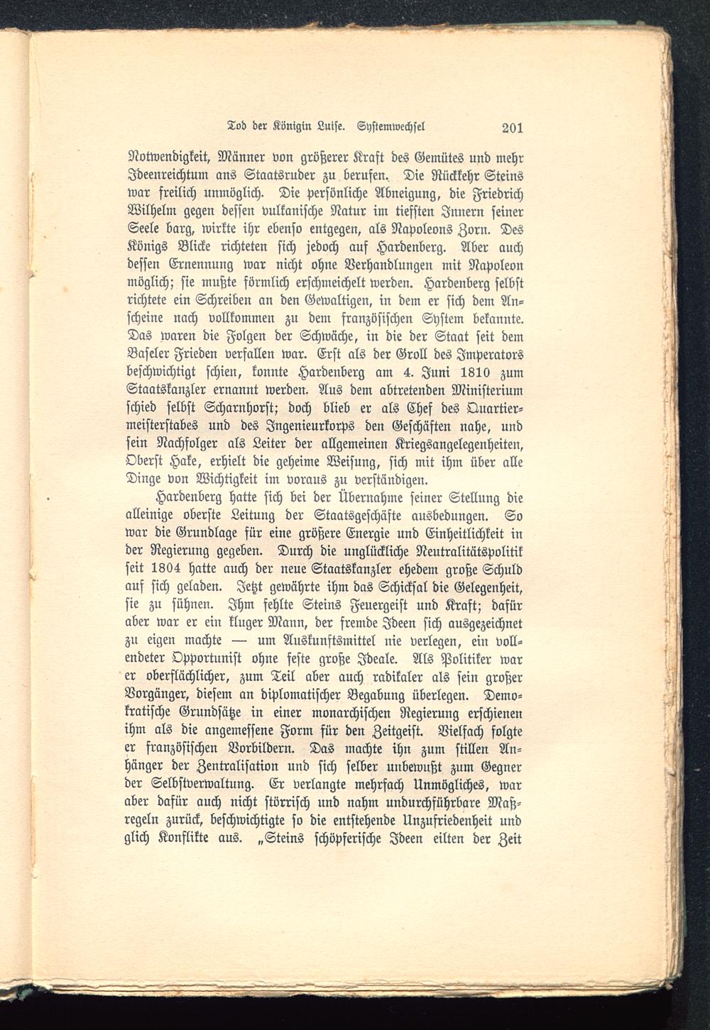 Notwendigkeit, Männer von größerer Kraft des Gemütes und mehrIdeenreichtum ans Staatsruder zu berufen. Die Rückkehr Steinswar freilich unmöglich. Die persönliche Abneigung, die FriedrichWilhelm gegen dessen vulkanische Natur im tiefsten Innern seinerSeele barg, wirkte ihr ebenso entgegen, als Napoleons Zorn. DesKönigs Blicke richteten sich jedoch auf Hardenberg. Aber auchdessen Ernennung war nicht ohne Verhandlungen mit Napoleon möglich; sie mußte förmlich erschmeichelt werden. Hardenberg selbstrichtete ein Schreiben an den Gewaltigen, in dem er sich dem An-scheine nach vollkommen zu dem französischen System bekannte.Das waren die Folgen der Schwäche, in die der Staat seit demBaseler Frieden verfallen war. Erst als der Groll des Imperatorsbeschwichtigt schien, konnte Hardenberg am 4. Juni 1810 zumStaatskanzler ernannt werden. Aus dem abtretenden Ministeriumschied selbst Scharnhorst; doch blieb er als Chef des Quartier-meisterstabes und des Jngenieurkorps den Geschäften nahe, undsein Nachfolger als Leiter der allgemeinen Kriegsangelegenheiten,Oberst Hake, erhielt die geheime Weisung, sich mit ihm über alleDinge von Wichtigkeit im voraus zu verständigen.