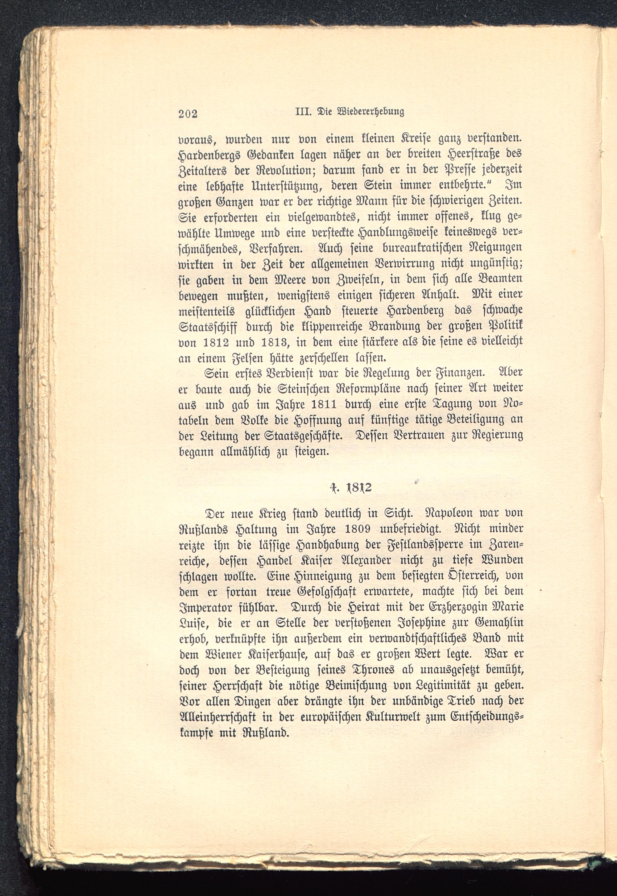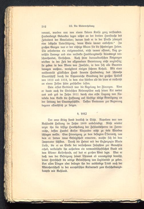 voraus, wurden nur von einem kleinen Kreise ganz verstanden.Hardenbergs Gedanken lagen näher an der breiten Heerstraße desZeitalters der Revolution; darum fand er in der Presse jederzeiteine lebhafte Unterstützung, deren Stein immer entbehrte." Imgroßen Ganzen war er der richtige Mann für die schwierigen Zeiten.Sie erforderten ein vielgewandtes, nicht immer offenes, klug ge-wählte Umwege und eine versteckte Handlungsweise keineswegs ver-schmähendes, Verfahren. Auch seine bureaukratischen Neigungenwirkten in der Zeit der allgemeinen Verwirrung nicht ungünstig;sie gaben in dem Meere von Zweifeln, in dem sich alle Beamtenbewegen mußten, wenigstens einigen sicheren Anhalt. Mit einermeistenteils glücklichen Hand steuerte Hardenberg das schwacheStaatsschiff durch die klippenreiche Brandung der großen Politikvon 1812 und 1813, in dem eine stärkere als die seine es vielleichtan einem Felsen hätte zerschellen lassen.