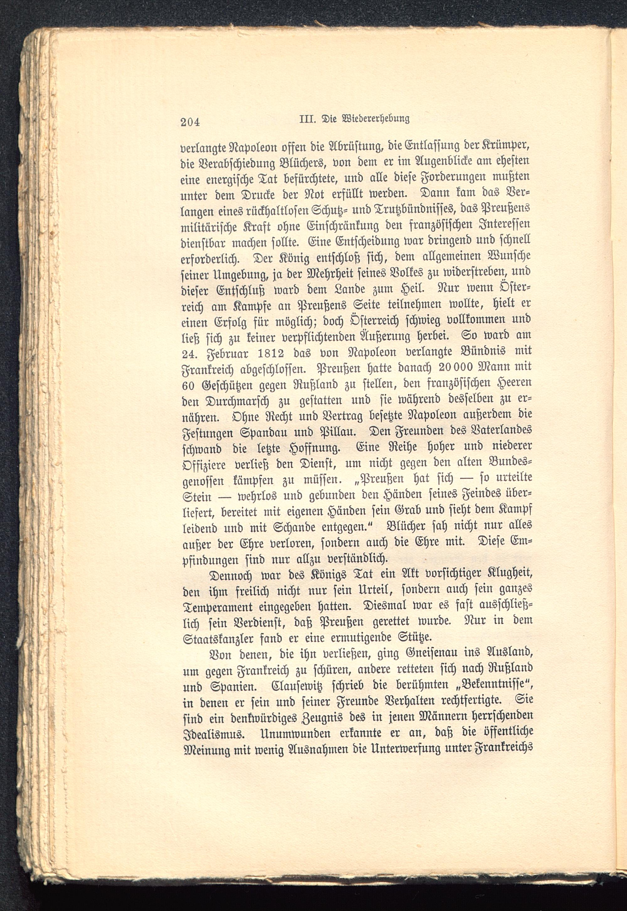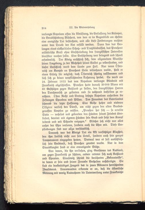 Von denen, die ihn verließen, ging Gneisenau ins Ausland,um gegen Frankreich zu schüren, andere retteten sich nach Rußland und Spanien. Clausewitz schrieb die berühmten „Bekenntnisse",in denen er sein und seiner Freunde Verhalten rechtfertigte. Siesind ein denkwürdiges Zeugnis des in jenen Männern herrschendenIdealismus. Unumwunden erkannte er an, daß die öffentlicheMeinung mit wenig Ausnahmen die Unterwerfung unter Frankreichs