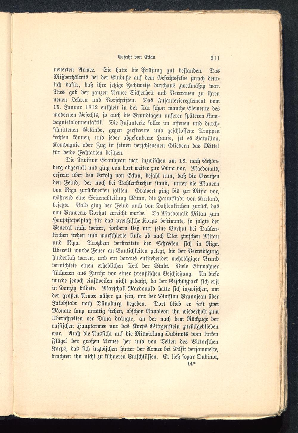 Die Division Grandjean war inzwischen am 13. nach Schön-berg abgerückt und ging von dort weiter zur Düna vor. Macdonald,erfreut über den Erfolg von Eckau, befahl nun, daß die Preußenden Feind, der noch bei Dahlenkirchen stand, unter die Mauernvon Riga zurückwerfen sollten. Grawert ging bis zur Missa vor,während eine Seitenabteilung Mitau , die Hauptstadt von Kurland,besetzte. Bald ging der Feind auch von Dahlenkirchen zurück, dasvon Grawerts Vorhut erreicht wurde. Da Macdonald Mitau zumHauptstapelplatz für das preußische Korps bestimmte, so folgte derGeneral nicht weiter, sondern ließ nur seine Vorhut bei Dahlen-kirchen stehen und marschierte links ab nach Olai zwischen Mitau und Riga. Trotzdem verbreitete der Schrecken sich in Riga .Übereilt wurde Feuer an Baulichkeiten gelegt, die der Verteidigunghinderlich waren, und ein daraus entstehender mehrtägiger Brandvernichtete einen erheblichen Teil der Stadt. Viele Einwohnerflüchteten aus Furcht vor einer preußischen Beschießung. An diesewurde jedoch einstweilen nicht gedacht, da der Geschützpark sich erstin Danzig bildete. Marschall Macdonald hatte sich inzwischen, umder großen Armee näher zu sein, mit der Division Grandjean überJakobstadt nach Dünaburg begeben. Dort blieb er fast zweiMonate lang untätig stehen, obschon Napoleon ihn wiederholt zumÜberschreiten der Düna drängte, an der nach dem Rückzüge derrussischen Hauptarmee nur das Korps Wittgenstein zurückgebliebenwar. Auch die Aussicht auf die Mitwirkung Oudinots vom linkenFlügel der großen Armee her und von Teilen des VictorschenKorps, das sich inzwischen hinter der Armee bei Tilsit versammelte,brachten ihn nicht zu kühneren Entschlüssen. Er ließ sogar Oudinot ,
