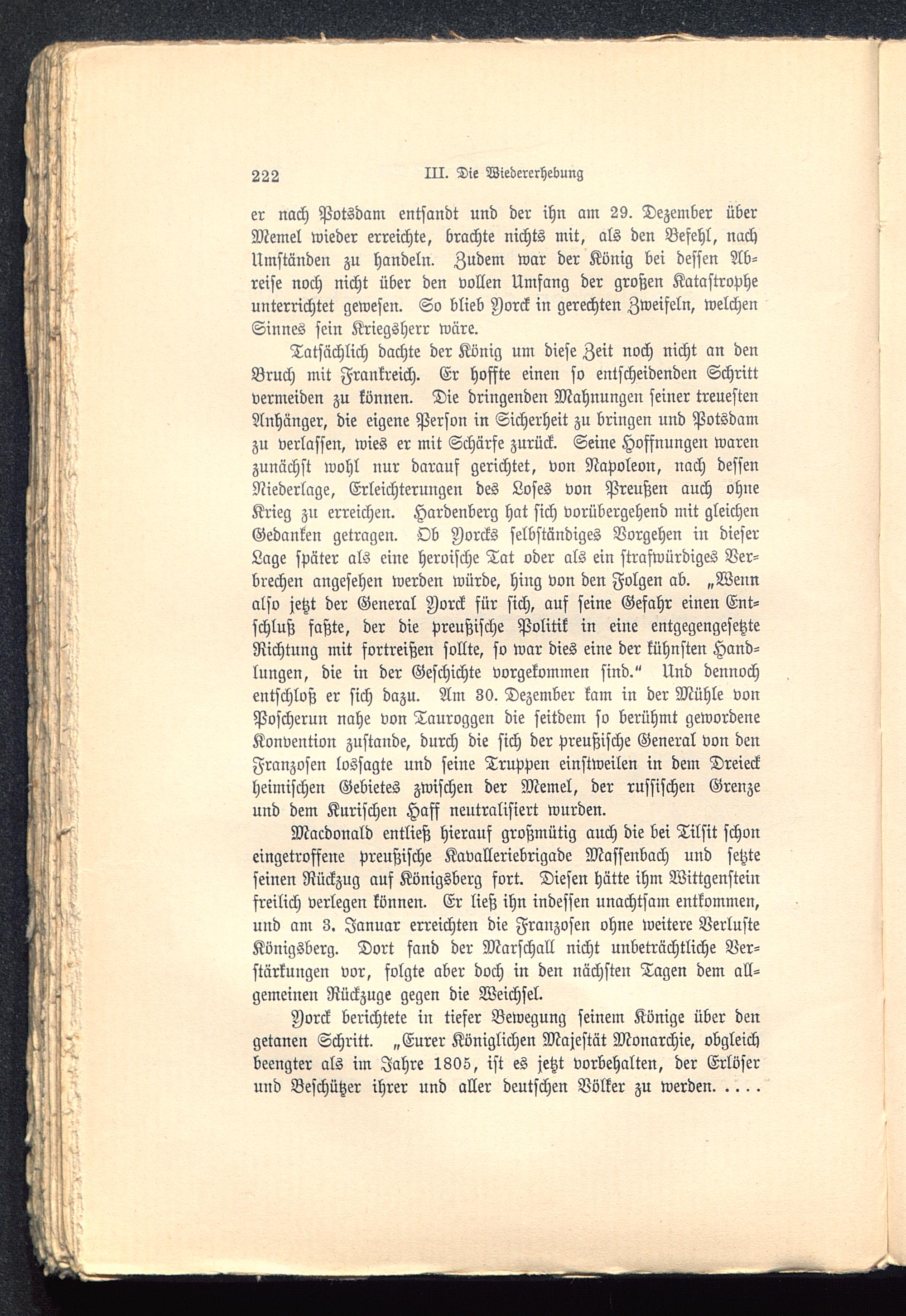 Jorck berichtete in tiefer Bewegung seinem Könige über dengetanen Schritt. „Eurer Königlichen Majestät Monarchie, obgleichbeengter als im Jahre 1805, ist es jetzt vorbehalten, der Erlöserund Beschützer ihrer und aller deutschen Völker zu werden.....