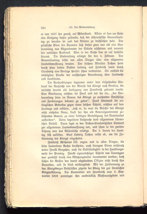 Friedrich Wilhelms IH. engem und in allen Dingen, dieseine souveränen Rechte berührten, auch strengem Sinne entsprachweder Jorcks Vorgehen, noch die Selbständigkeit in der Handlungs-weise der Provinz. Jorcks eigenmächtiger Schritt von Tauroggenwar zunächst durch eine Absetzungsorder beantwortet worden; dochließen die Russen den damit abgesandten Offizier nicht durch ihreVorposten, und sie blieb wirkungslos. Mit der Zustimmung zuden Königsberger Beschlüssen zögerte der König bis zur förmlichenKriegserklärung. Die Konvention mit Frankreich vom 8. Sep-tember 1808 untersagte ihm ausdrücklich Massenaufgebote und