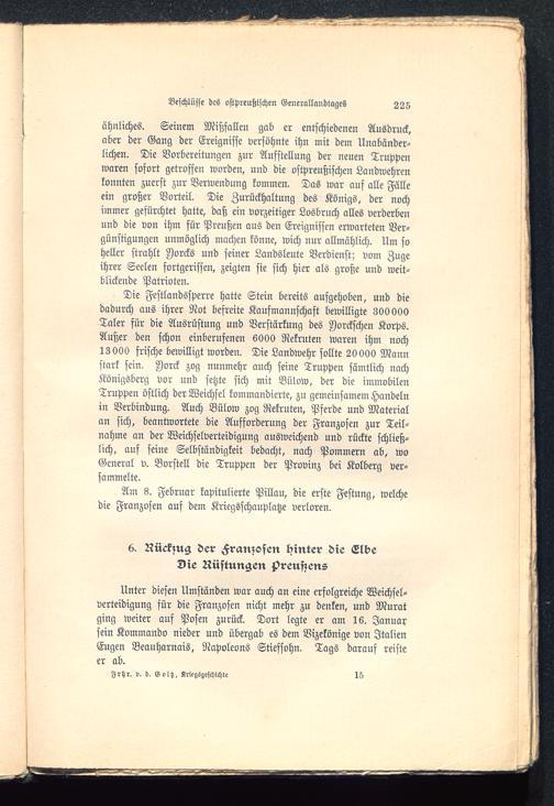Die Festlandssperre hatte Stein bereits aufgehoben, und diedadurch aus ihrer Not befreite Kaufmannschaft bewilligte 300000Taler für die Ausrüstung und Verstärkung des Jorckschen Korps.Außer den schon einberufenen 6000 Rekruten waren ihm noch13 000 frische bewilligt worden. Die Landwehr sollte 20 000 Mannstark sein. Jorck zog nunmehr auch seine Truppen sämtlich nachKönigsberg vor und setzte sich mit Bülow, der die immobilenTruppen östlich der Weichsel kommandierte, zu gemeinsamem Handelnin Verbindung. Auch Bülow zog Rekruten, Pferde und Materialan sich, beantwortete die Aufforderung der Franzosen zur Teil-nahme an der Weichselverteidigung ausweichend und rückte schließ-lich, auf seine Selbständigkeit bedacht, nach Pommern ab, woGeneral v. Borstell die Truppen der Provinz bei Kolberg ver-sammelte.
