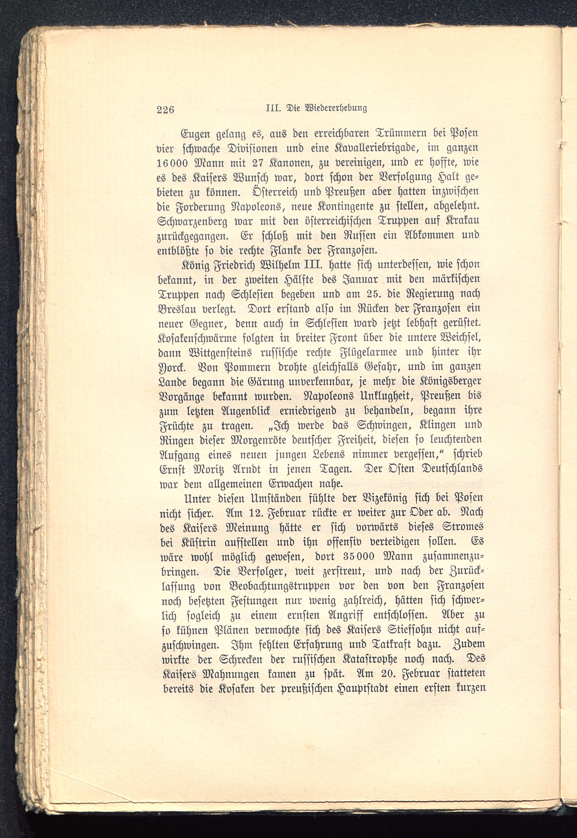 Unter diesen Umständen fühlte der Vizekönig sich bei Posennicht sicher. Am 12. Februar rückte er weiter zur Oder ab. Nachdes Kaisers Meinung hätte er sich vorwärts dieses Stromesbei Küstrin ausstellen und ihn offensiv verteidigen sollen. Eswäre wohl möglich gewesen, dort 35 000 Mann zusammenzu-bringen. Die Verfolger, weit zerstreut, und nach der Zurück-lassung von Beobachtungstruppen vor den von den Franzosennoch besetzten Festungen nur wenig zahlreich, hätten sich schwer-lich sogleich zu einem ernsten Angriff entschlossen. Aber zuso kühnen Plänen vermochte sich des Kaisers Stiefsohn nicht auf-zuschwingen. Ihm fehlten Erfahrung und Tatkraft dazu. Zudemwirkte der Schrecken der russischen Katastrophe noch nach. DesKaisers Mahnungen kamen zu spät. Am 20. Februar stattetenbereits die Kosaken der preußischen Hauptstadt einen ersten kurzen