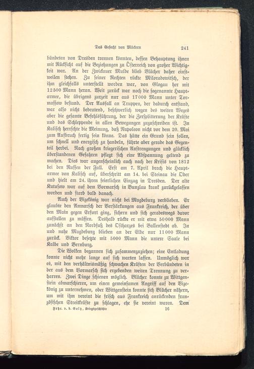 bündeten von Dresden trennen könnten, dessen Behauptung ihnenmit Rücksicht auf die Beziehungen zu Österreich von großer Wichtig-keit war. An der Zwickauer Mulde blieb Blücher daher einst-weilen stehen. Zu seiner Rechten rückte Miloradowitsch, derihm gleichfalls unterstellt worden war, von Glogau her mit12 500 Mann heran. Weit zurück war noch die sogenannte Haupt-armee, die übrigens zurzeit nur aus 17 000 Mann unter Tor-massow bestand. Der Ausfall an Truppen, der dadurch entstand,war also nicht bedeutend, beschwerlich wegen des weiten Wegesaber die gesamte Befehlsführung, der die Zersplitterung der Kräfteund das Schleppende in allen Bewegungen zuzuschreiben ist. InKalisch herrschte die Meinung, daß Napoleon nicht vor dem 20. Maizum Aufbruch fertig sein könne. Das hätte ein Grund sein sollen,um schnell und energisch zu handeln, führte aber gerade das Gegen-teil herbei. Nach großen kriegerischen Anstrengungen und glücklichüberstandenen Gefahren Pflegt sich eine Abspannung geltend zumachen. Dies war augenscheinlich auch nach der Krisis von 1812bei den Russen der Fall. Erst am 7. April brach die Haupt-armee von Kalisch auf, überschritt am 14. bei Steinau die Oderund hielt am 24. ihren feierlichen Einzug in Dresden . Der alteKutusow war auf dem Vormarsch in Bunzlau krank zurückgelassenworden und starb bald danach.