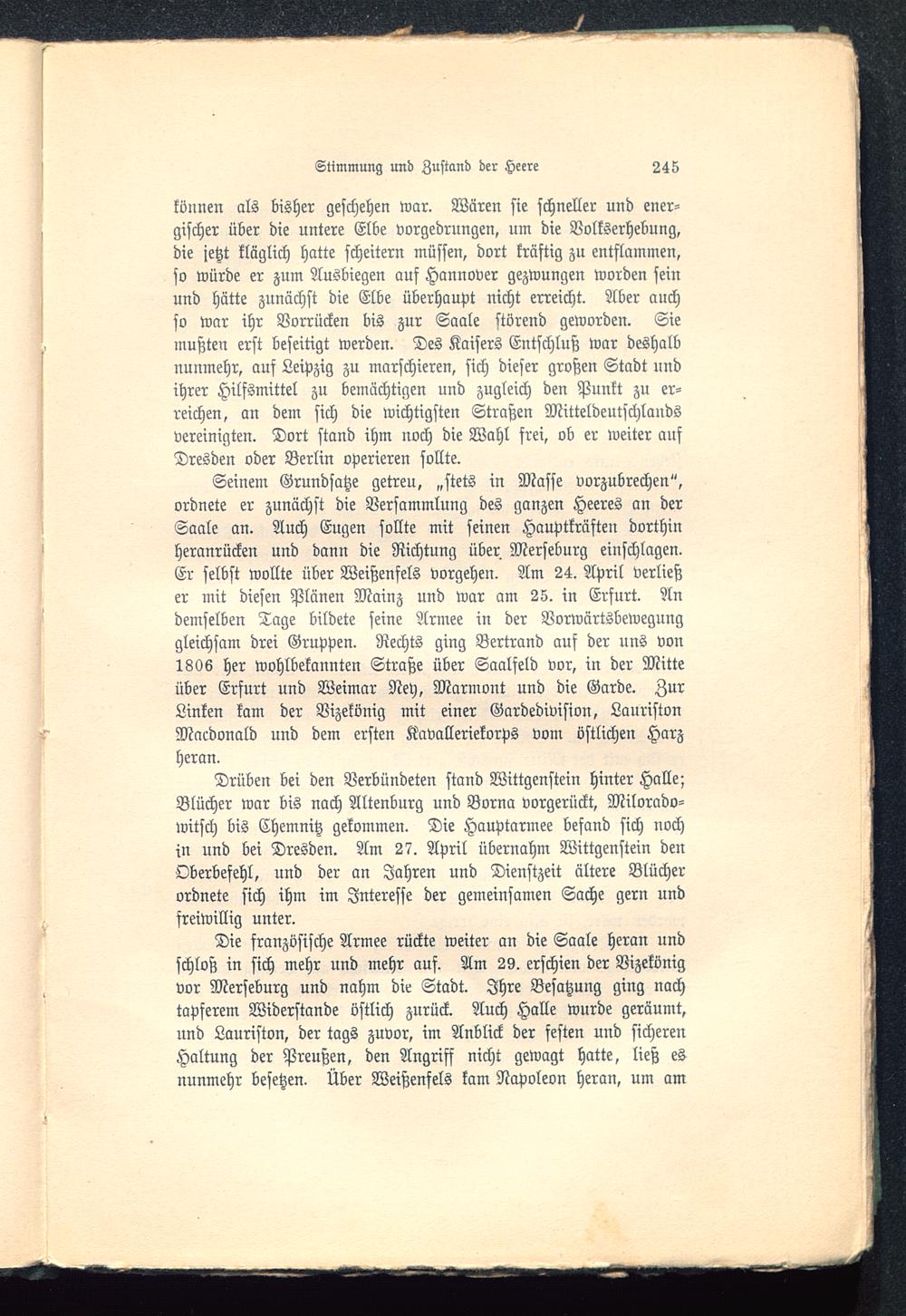 Seinem Grundsatze getreu, „stets in Masse vorzubrechen",ordnete er zunächst die Versammlung des ganzen Heeres an derSaale an. Auch Eugen sollte mit seinen Hauptkräfteu dorthinheranrücken und dann die Richtung über Merseburg einschlagen.Er selbst wollte über Weißenfels vorgehen. Am 24. April verließer mit diesen Plänen Mainz und war am 25. in Erfurt . Andemselben Tage bildete seine Armee in der Vorwärtsbewegunggleichsam drei Gruppen. Rechts ging Bertrand auf der uns von1806 her wohlbekannten Straße über Saalfeld vor, in der Mitteüber Erfurt und Weimar Ney, Marmont und die Garde. ZurLinken kam der Vizekönig mit einer Gardedivision, LauristonMacdonald und dem ersten Kavalleriekorps vom östlichen Harzheran.