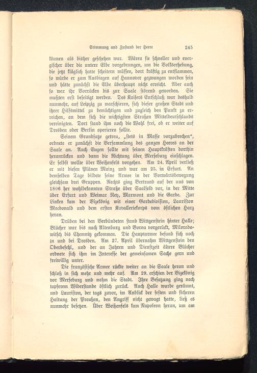 können als bisher geschehen war. Wären sie schneller und ener-gischer über die untere Elbe vorgedrungen, um die Volkserhebung,die jetzt kläglich hatte scheitern müssen, dort kräftig zu entflammen,so würde er zum Ausbiegeu auf Hannover gezwungen worden seinund hätte zunächst die Elbe überhaupt nicht erreicht. Aber auchso war ihr Vorrücken bis zur Saale störend geworden. Siemußten erst beseitigt werden. Des Kaisers Entschluß war deshalbnunmehr, auf Leipzig zu marschieren, sich dieser großen Stadt undihrer Hilfsmittel zu bemächtigen und zugleich den Punkt zu er-reichen, an dem sich die wichtigsten Straßen Mitteldeutschlands vereinigten. Dort stand ihm noch die Wahl frei, ob er weiter aufDresden oder Berlin operieren sollte.