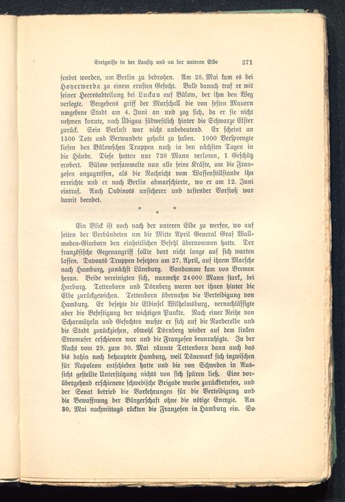 sendet worden, um Berlin zu bedrohen. Am 28. Mai kam es beiHoyerwerda zu einem ernsten Gefecht. Bald danach traf er mitfeiner Heeresabteilung bei Luckau auf Bülow, der ihm deu Wegverlegte. Vergebens griff der Marschall die von festen Mauernumgebene Stadt am 4. Juni an und zog sich, da er sie nichtnehmen konnte, nach Übigau südwestlich hinter die Schwarze Elsterzurück. Sein Verlust war nicht unbedeutend. Er scheint an1500 Tote und Verwundete gehabt zu haben. 1000 Versprengteliefen den Bülowschen Truppen noch in den nächsten Tagen indie Hände. Diese hatten nur 720 Mann verloren, 1 Geschützerobert. Bülow versammelte nuu alle seine Kräfte, um die Fran-zosen anzugreifen, als die Nachricht vom Waffenstillstände ihnerreichte und er nach Berlin abmarschierte, wo er am 12. Junieintraf. Auch Oudinots unsicherer und tastender Vorstoß wardamit beendet.