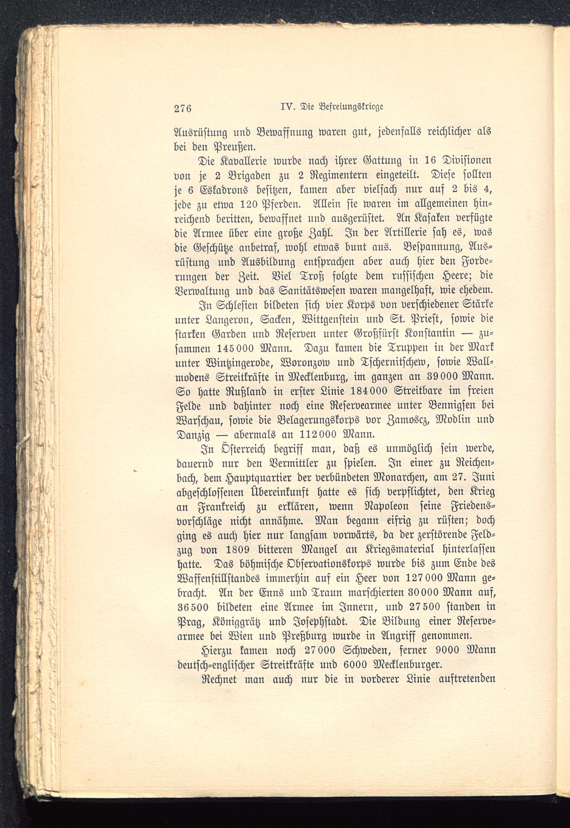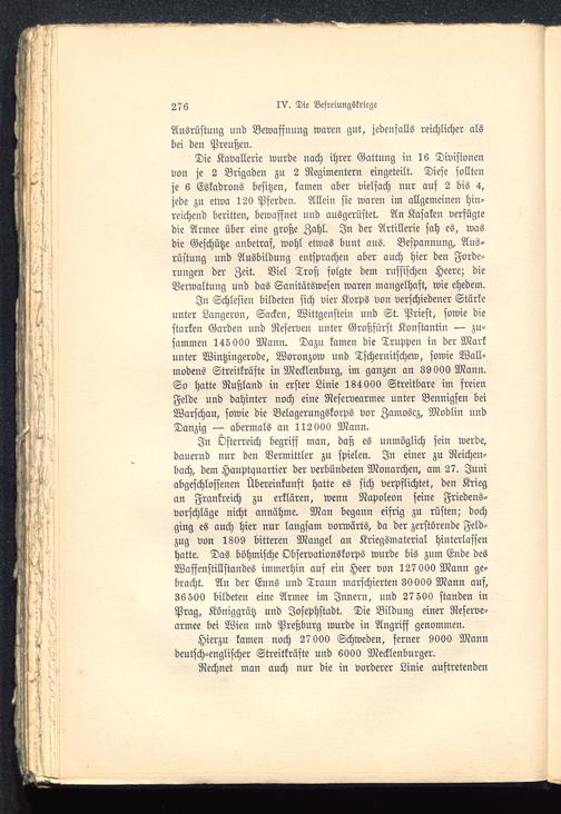 In Schlesien bildeten sich vier Korps von verschiedener Stärkeunter Langeron, Sacken, Wittgenstein und St. Priest, sowie diestarken Garden und Reserven unter Großfürst Konstantin — zu-sammen 145000 Mann. Dazu kamen die Truppen in der Markunter Wintzingerode, Woronzow und Tschernitschew, sowie Wall-modens Streitkräfte in Mecklenburg , im ganzen an 39 000 Mann.So hatte Rußland in erster Linie 184 000 Streitbare im freienFelde und dahinter noch eine Reservearmee unter Bennigsen beiWarschau , sowie die Belagerungskorps vor Zamoscz, Modlin undDanzig — abermals an 112 000 Mann.