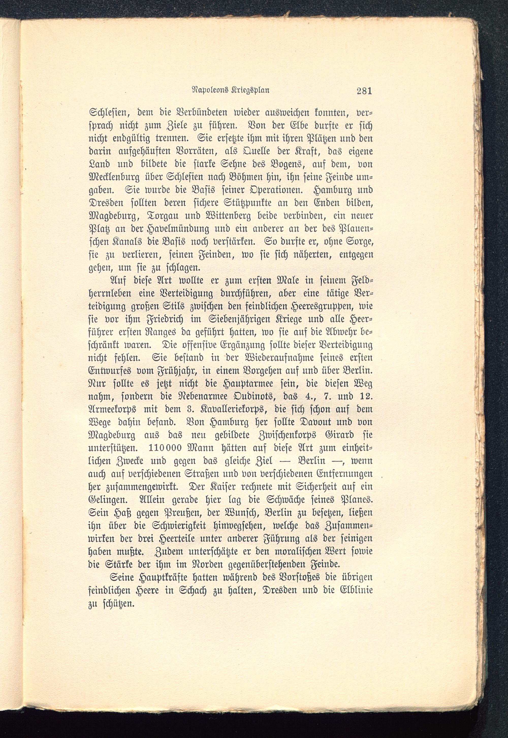 Auf diese Art wollte er zum ersten Male in seinem Feld-herrnleben eine Verteidigung durchführen, aber eine tätige Ver-teidigung großen Stils zwischen den feindlichen Heeresgruppen, wiesie vor ihm Friedrich im Siebenjährigen Kriege und alle Heer-führer ersten Ranges da geführt hatten, wo sie ans die Abwehr be-schränkt waren. Die offensive Ergänzung sollte dieser Verteidigungnicht fehlen. Sie bestand in der Wiederaufnahme seines erstenEntwurfes vom Frühjahr, in einem Vorgehen auf und über Berlin .Nur sollte es jetzt nicht die Hauptarmee sein, die diesen Wegnahm, sondern die Nebenarmee Oudinots, das 4., 7. und IS.Armeekorps mit dem 3. Kavalleriekorps, die sich schon auf demWege dahin befand. Von Hamburg her sollte Davout und vonMagdeburg aus das neu gebildete Zwischenkorps Girard sieunterstützen. 110000 Mann hätten auf diese Art zum einheit-lichen Zwecke und gegen das gleiche Ziel — Berlin —, wennauch auf verschiedenen Straßen und von verschiedenen Entfernungenher zusammengewirkt. Der Kaiser rechnete mit Sicherheit auf einGelingen. Allein gerade hier lag die Schwäche seines Planes.Sein Haß gegen Preußen, der Wunsch, Berlin zu besetzen, ließenihn über die Schwierigkeit hinwegsehen, welche das Zusammen-wirken der drei Heerteile unter anderer Führung als der seinigenhaben mußte. Zudem unterschätzte er den moralischen Wert sowiedie Stärke der ihm im Norden gegenüberstehenden Feinde.
