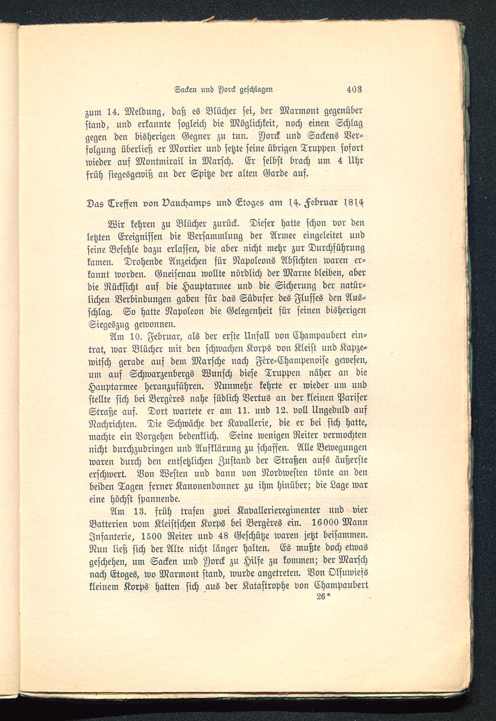 zum 14. Meldung, daß es Blücher sei, der Marmont gegenüberstand, und erkannte sogleich die Möglichkeit, noch einen Schlaggegen den bisherigen Gegner zu tun. Jorck und Sackens Ver-folgung überließ er Mortier und setzte seine übrigen Truppen sofortwieder auf Montmirail in Marsch. Er selbst brach um 4 Uhrfrüh siegesgewiß an der Spitze der alten Garde auf.