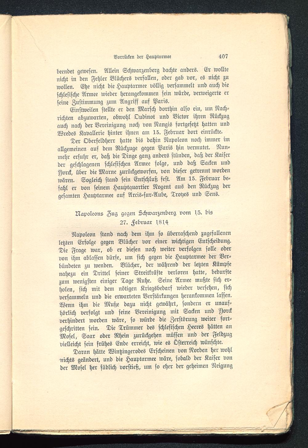 Der Oberfeldherr hatte bis dahin Napoleon noch immer imallgemeinen auf dem Rückzüge gegen Paris hin vermutet. Nun-mehr erfuhr er, daß die Dinge ganz anders stünden, daß der Kaiserder geschlagenen schlesischen Armee folge, und daß Sacken undJorck, über die Marne zurückgeworfen, von dieser getrennt wordenwären. Sogleich stand sein Entschluß fest. Am 15. Februar be-fahl er von seinem Hauptquartier Nogent aus den Rückzug dergesamten Hauptarmee auf Arcis-sur-Aube, Troyes und Sens.