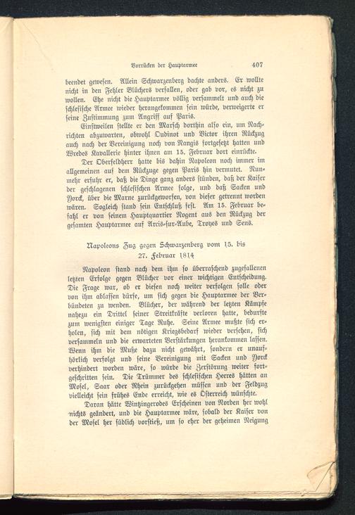 Napoleon stand nach dem ihm so überraschend zugefallenenletzten Erfolge gegen Blücher vor einer wichtigen Entscheidung.Die Frage war, ob er diesen noch weiter verfolgen solle odervon ihm ablassen dürfe, um sich gegen die Hauptarmee der Ver-bündeten zu wenden. Blücher, der während der letzten Kämpfenahezu ein Drittel seiner Streitkräfte verloren hatte, bedürftezum wenigsten einiger Tage Ruhe. Seine Armee mußte sich er-holen, sich mit dem nötigen Kriegsbedarf wieder versehen, sichversammeln und die erwarteten Verstärkungen herankommen lassen.Wenn ihm die Muße dazu nicht gewährt, sondern er unauf-hörlich verfolgt und seine Vereinigung mit Sacken und A^ckverhindert worden wäre, so würde die Zerstörung weiter fort-geschritten sein. Die Trümmer des schlesischen Heeres hätten anMosel, Saar oder Rhein zurückgehen müssen und der Feldzugvielleicht fein frühes Ende erreicht, wie es Österreich wünschte.