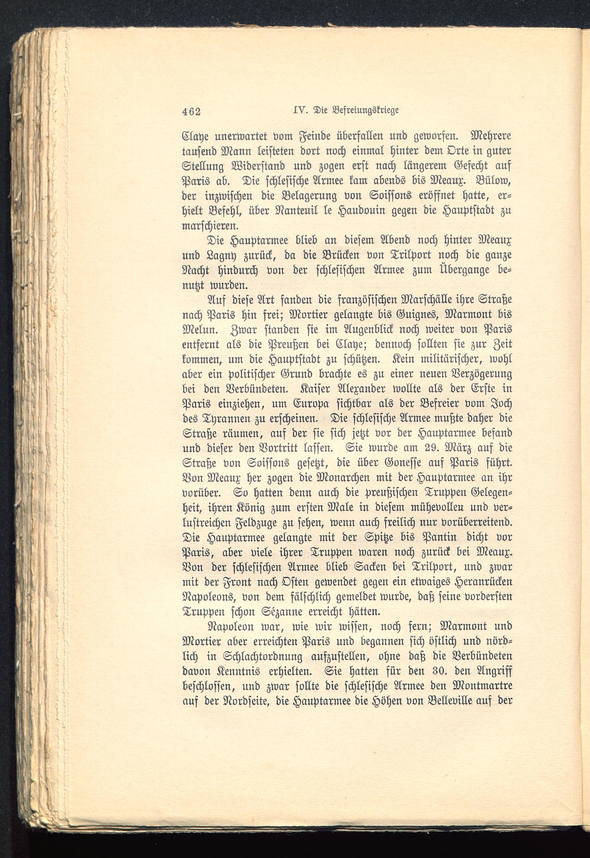 Auf diese Art fanden die französischen Marschälle ihre Straßenach Paris hin frei; Mortier gelangte bis Guignes, Marmont bisMelun. Zwar standen sie im Augenblick noch weiter von Paris entfernt als die Preußen bei Claye; dennoch sollten sie zur Zeitkommen, um die Hauptstadt zu schützen. Kein militärischer, wohlaber ein politischer Grund brachte es zu einer neuen Verzögerungbei den Verbündeten. Kaiser Alexander wollte als der Erste inParis einziehen, um Europa sichtbar als der Befreier vom Jochdes Tyrannen zu erscheinen. Die schlesische Armee mußte daher dieStraße räumen, auf der sie sich jetzt vor der Hauptarmee befandund dieser den Vortritt lassen. Sie wurde am 29. März auf dieStraße von Soissons gesetzt, die über Gonesse auf Paris führt.Von Meaux her zogen die Monarchen mit der Hauptarmee an ihrvorüber. So hatten denn auch die preußischen Truppen Gelegen-heit, ihren König zum ersten Male in diesem mühevollen und ver-lustreichen Feldzuge zu sehen, wenn auch freilich nur vorüberreitend.Die Hauptarmee gelangte mit der Spitze bis Pantin dicht vorParis, aber viele ihrer Truppen waren noch zurück bei Meaux .Von der schlesischen Armee blieb Sacken bei Trilport, und zwarmit der Front nach Osten gewendet gegen ein etwaiges HeranrückenNapoleons , von dem fälschlich gemeldet wurde, daß seine vorderstenTruppen schon Sezanne erreicht hätten.