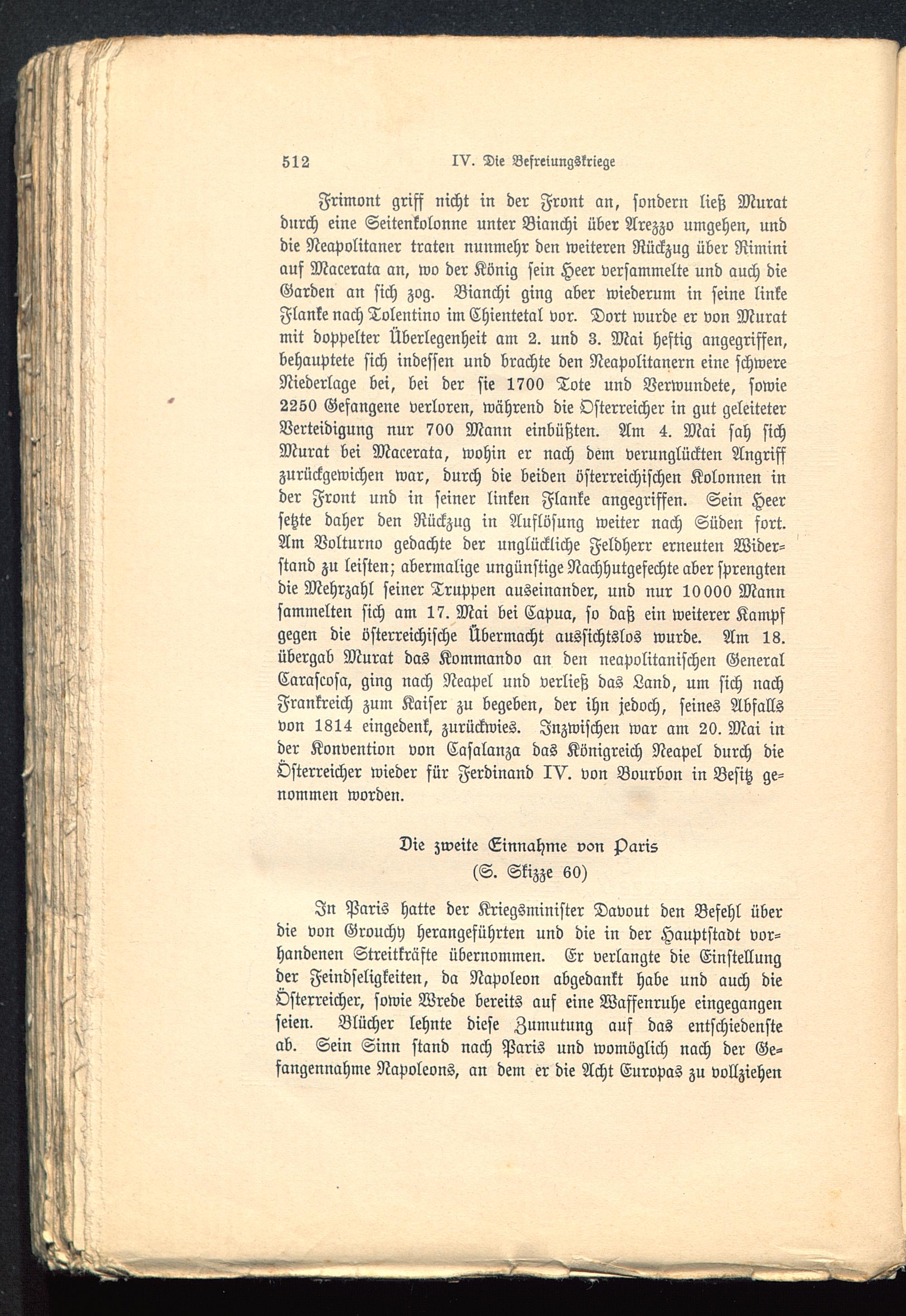 Frimont griff nicht in der Front an, sondern ließ Muratdnrch eine Seitenkolonne unter Bianchi über Arezzo umgehen, unddie Neapolitaner traten nunmehr den weiteren Rückzug über Rimini auf Macerata an, wo der König sein Heer versammelte und auch dieGarden an sich zog. Bianchi ging aber wiederum in seine linkeFlanke nach Tolentino im Chientetal vor. Dort wurde er von Muratmit doppelter Überlegenheit am 2. und 3. Mai heftig angegriffen,behauptete sich indessen und brachte den Neapolitanern eine schwereNiederlage bei, bei der sie 1700 Tote und Verwundete, sowie2250 Gefangene verloren, während die Österreicher in gut geleiteterVerteidigung nur 700 Mann einbüßten. Am 4. Mai sah sichMurat bei Macerata , wohin er nach dem verunglückten Angriffzurückgewichen war, durch die beiden österreichischen Kolonnen inder Front und in seiner linken Flanke angegriffen. Sein Heersetzte daher den Rückzug in Auflösung weiter nach Süden fort.Am Volturno gedachte der unglückliche Feldherr erneuten Wider-stand zu leisten; abermalige ungünstige Nachhutgefechte aber sprengtendie Mehrzahl seiner Truppen auseinander, und nur 10000 Mannsammelten sich am 17. Mai bei Capua, so daß ein weiterer Kampfgegen die österreichische Übermacht aussichtslos wurde. Am 18.übergab Murat das Kommando an den neapolitanischen GeneralCarascosa, ging nach Neapel und verließ das Land, um sich nachFrankreich zum Kaiser zu begeben, der ihn jedoch, seines Abfallsvon 1814 eingedenk, zurückwies. Inzwischen war am 20. Mai inder Konvention von Casalanza das Königreich Neapel durch dieÖsterreicher wieder für Ferdinand IV. von Bourbon in Besitz ge-nommen worden.