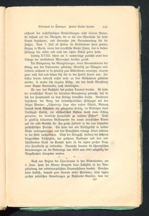So war das Nachspiel des großen Dramas beendet. Es hatteder preußischen Armee die besondere Genugtuung gebracht, daß siesich den Hauptanteil an dem Erfolge beimessen durfte. Gneisenaubezeichnete den Gang des dreiwöchentlichen Feldzuges mit denstolzen Worten: „Schwierige Lage ohne unsere Schuld, Rettungdaraus durch Kühnheit, ein glänzender Erfolg, ein Verfolgen einerTreibjagd ähnlich, ein abscheuliches System durch einen Schlagzermalmt, die feindliche Hauptstadt zu unseren Füßen!" Dieseso glücklich bestandene Waffenprobe der neuen preußischen Armeegab die erste Gewähr für ihre große Zukunft in der nun folgendengeschichtlichen Periode. Sie hatte das alte Selbstgefühl in vollemMaße wiedergewonnen und das Bewußtsein erlangt, keiner anderenin der Welt nachzustehen. Nicht der Überzahl, sondern der höherenkriegerischen Tüchtigkeit, der größeren Ausdauer und dem ent-schlosseneren Ernst im Kampfe hatte sie die letzten großen Siegeüber Frankreich zu verdanken. Nunmehr konnten die schmerzlichenErinnerungen an die Niederlage von 1806 und 1807 endgültig derVergessenheit übergeben werden.