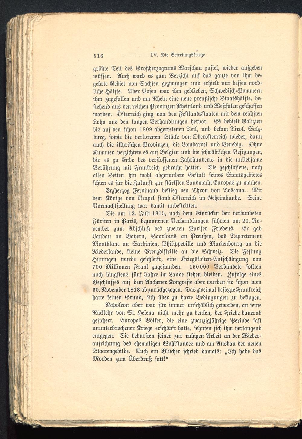 Die am 12. Juli 1815, nach dem Einrücken der verbündetenFürsten in Paris , begonnenen Verhandlungen führten am 20. No-vember zum Abschluß des zweiten Pariser Friedens. Er gabLandau an Bayern, Saarlouis an Preußen , das DepartementMontblanc an Sardinien , Philippeville und Marienbourg an dieNiederlande, kleine Grenzdistrikte an die Schweiz . Die FestungHüningen wurde geschleift, eine Kriegskosten-Entschädigung von700 Millionen Frank zugestanden. 150 000 Verbündete solltennoch längstens fünf Jahre im Lande stehen bleiben. Zufolge einesBeschlusses auf dem Aachener Kongresse aber wurden sie schon vom30. November 1818 ab zurückgezogen. Das zweimal besiegte Frankreich hatte keinen Grund, sich über zu harte Bedingungen zu beklagen.