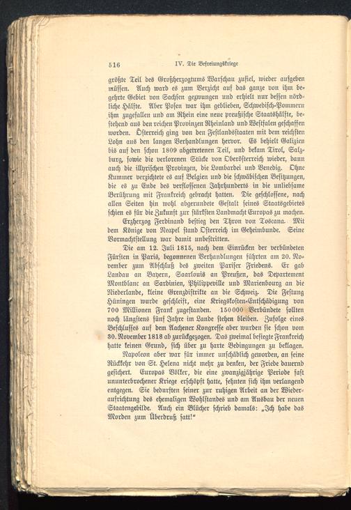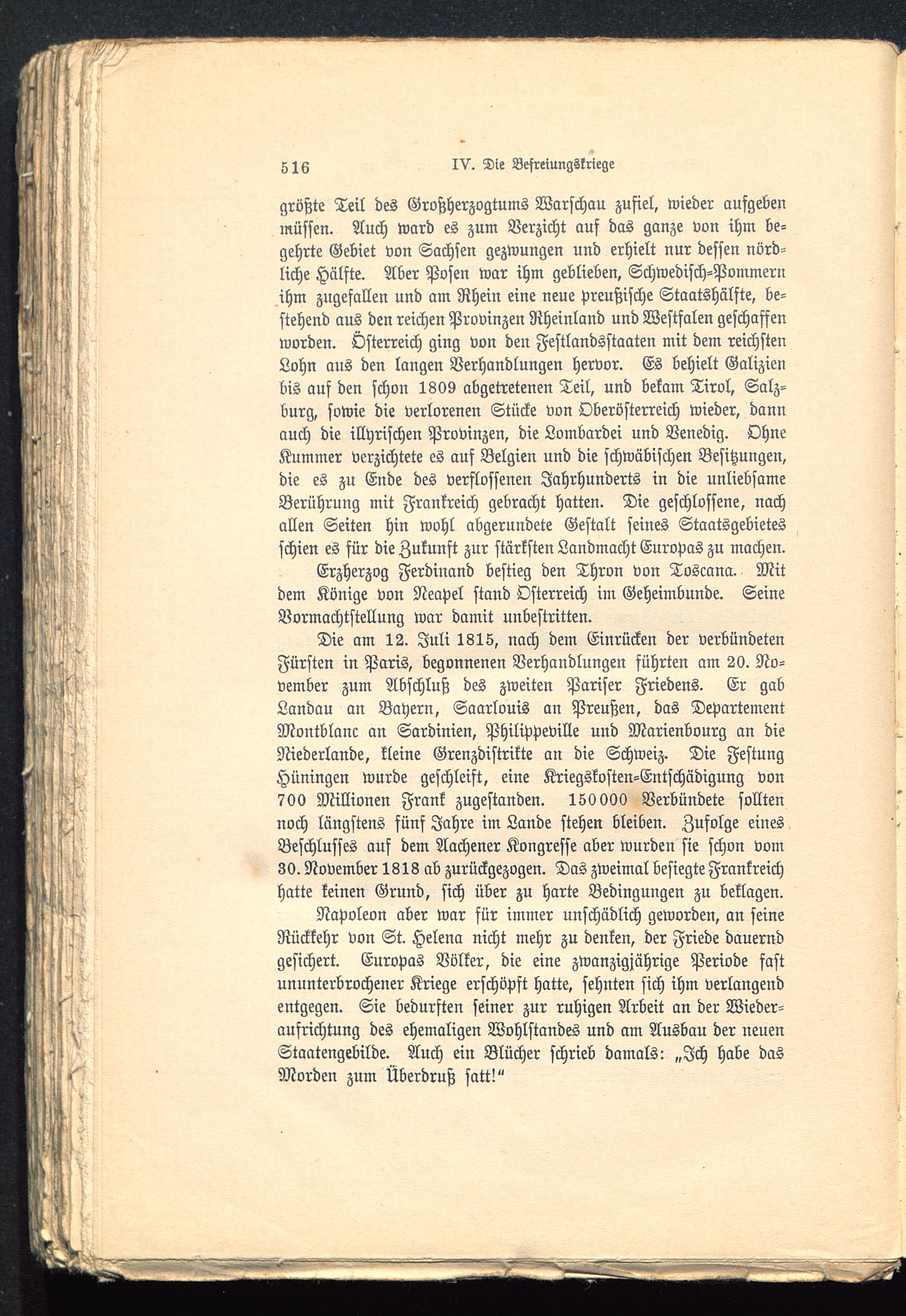 Napoleon aber war für immer unschädlich geworden, an seineRückkehr von St. Helena nicht mehr zu denken, der Friede dauerndgesichert. Europas Völker, die eine zwanzigjährige Periode fastununterbrochener Kriege erschöpft hatte, sehnten sich ihm verlangendentgegen. Sie bedurften seiner zur ruhigen Arbeit an der Wieder-aufrichtung des ehemaligen Wohlstandes und am Ausbau der neuenStaatengebilde. Auch ein Blücher schrieb damals: „Ich habe dasMorden zum Überdruß satt!"