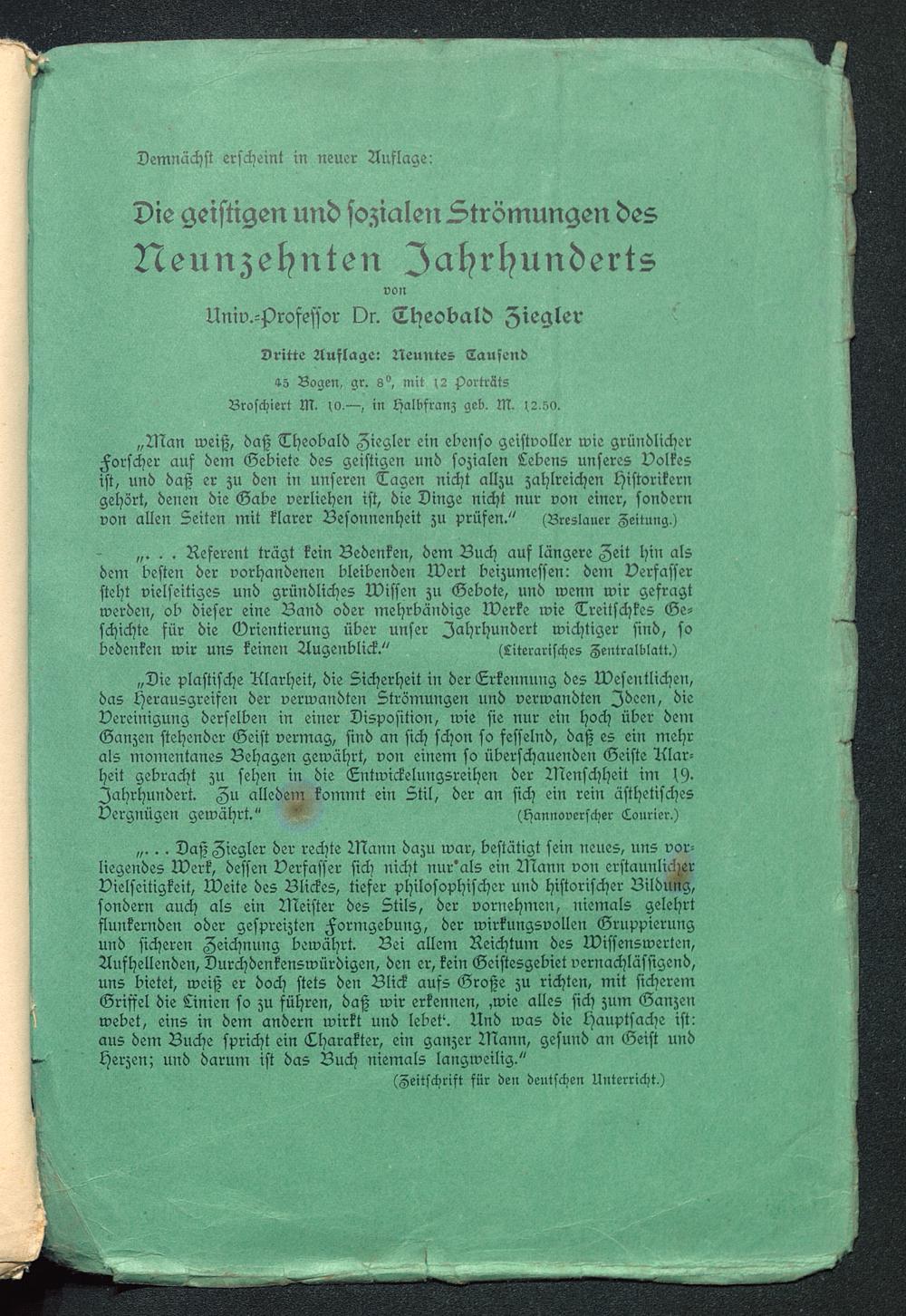 „Man Weiß, daß Theobald Ziegler ein ebenso geistvoller Wie gründlicherForscher auf dem Gebiete des geistigen und sozialen Lebens unseres Volkesist, und daß er zu den in unseren Tagen nicht allzu zahlreichen Historikerngehört, denen die Gabe verliehen ist, die Dinge nicht nur von einer, sondernvon allen Seiten mit klarer Besonnenheit zu prüfen." (Breslauer Zeitung.)