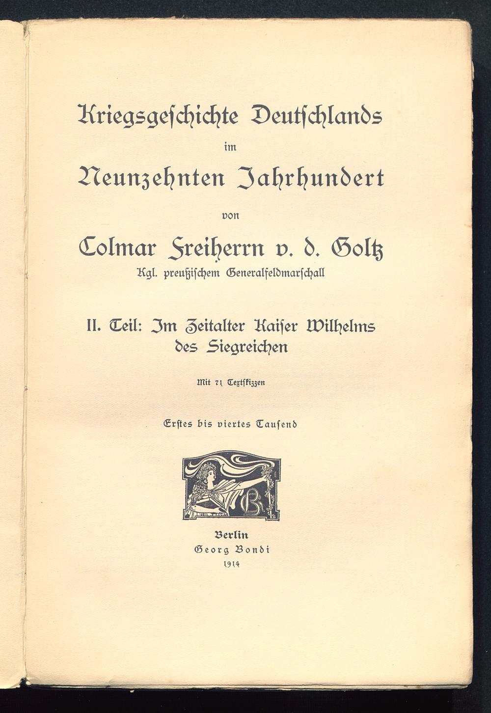 Ariegsgeschichte Deutschlands imNeunzehnten Jahrhundertvon(Lolmar Hreiherrn v. d. GoltzRgl. preußischem Generalfeldmarschallll. Teil: Zeitalter Raiser Wilhelmsdes siegreichenMit ?^ TextskizzenErstes bis viertes TausendBerlin Georg Bondi1?^