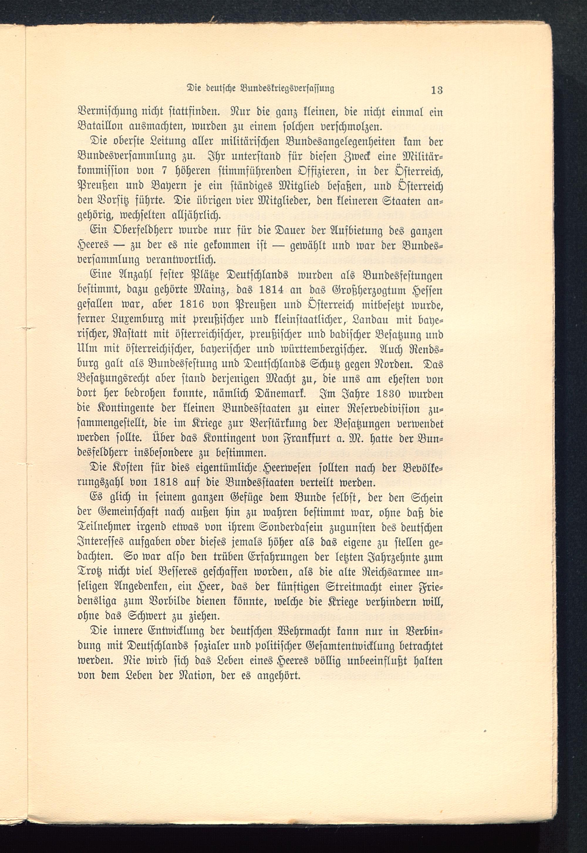 Eine Anzahl fester Plätze Deutschlands wurden als Bundesfestungenbestimmt, dazu gehörte Mainz, das 1814 an das Großherzogtum Hessen gefallen war, aber 1816 von Preußen und Österreich mitbesetzt wurde,ferner Luxemburg mit preußischer und kleinstaatlicher, Landau mit baye-rischer, Rastatt mit österreichischer, preußischer und badischer Besatzung undUlm mit österreichischer, bayerischer und württembergischer. Auch Rends-burg galt als Bundesfestung und Deutschlands Schutz gegen Norden. DasBesatzungsrecht aber stand derjenigen Macht zu, die uns am ehesten vondort her bedrohen konnte, nämlich Dänemark . Im Jahre 1830 wurdendie Kontingente der kleinen Bundesstaaten zu einer Reservedivision zu-sammengestellt, die im Kriege zur Verstärkung der Besatzungen verwendetwerden sollte. Über das Kontingent von Frankfurt a. M. hatte der Bun-desfeldherr insbesondere zu bestimmen.