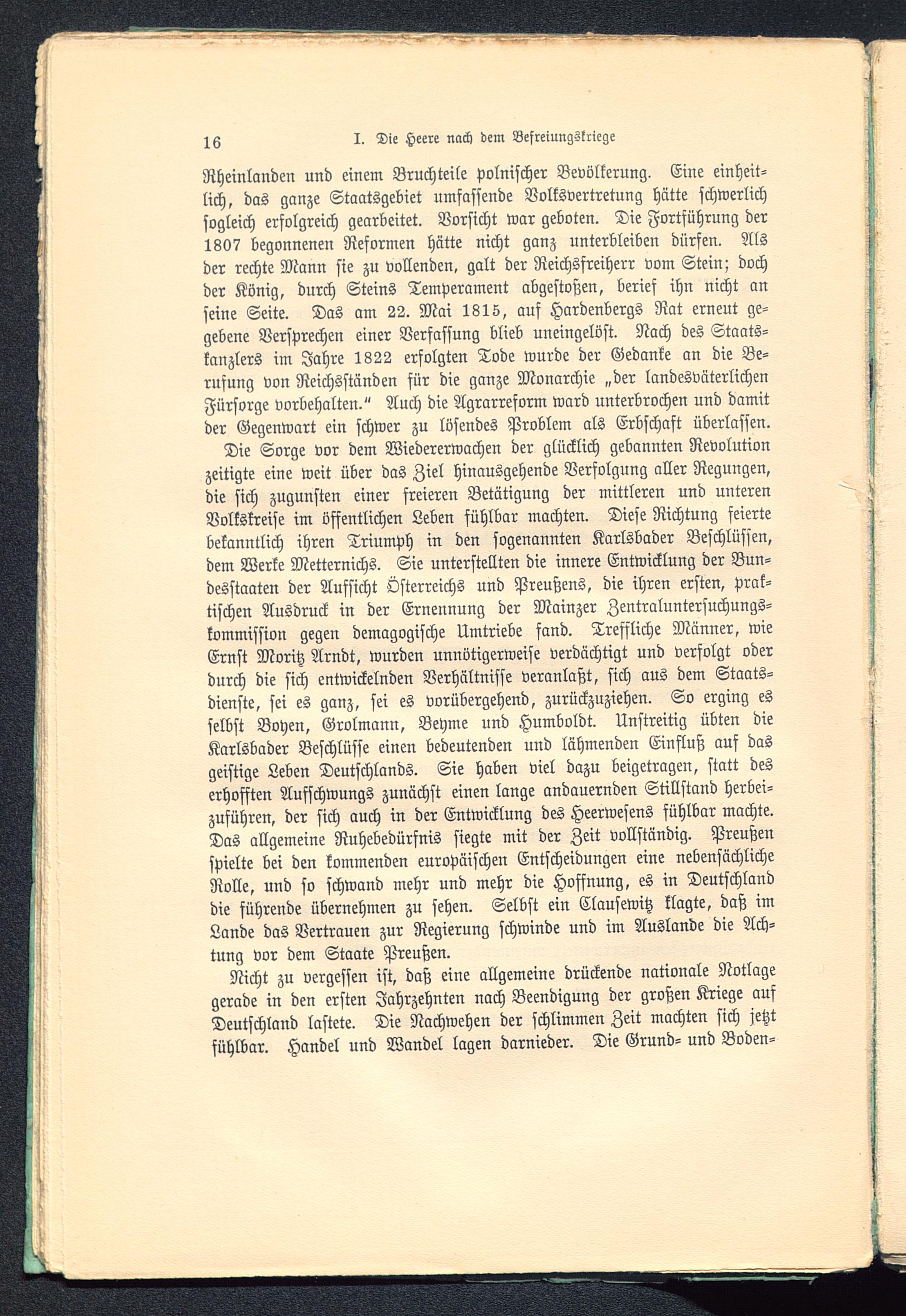 Die Sorge vor dem Wiedererwachen der glücklich gebannten Revolutionzeitigte eine weit über das Ziel hinausgehende Verfolgung aller Regungen,die sich zugunsten einer freieren Betätigung der mittleren und unterenVolkskreise im öffentlichen Leben fühlbar machten. Diese Richtung feiertebekanntlich ihren Triumph in den sogenannten Karlsbader Beschlüssen,dem Werke Metternichs . Sie unterstellten die innere Entwicklung der Bun-desstaaten der Aufsicht Österreichs und Preußens , die ihren ersten, prak-tischen Ausdruck in der Ernennung der Mainzer Zentraluntersuchungs-kommission gegen demagogische Umtriebe fand. Treffliche Männer, wieErnst Moritz Arndt , wurden unnötigerweise verdächtigt und verfolgt oderdurch die sich entwickelnden Verhältnisse veranlaßt, sich aus dem Staats-dienste, sei es ganz, sei es vorübergehend, zurückzuziehen. So erging esselbst Boyen, Grolmann, Beyme und Humboldt. Unstreitig übten dieKarlsbader Beschlüsse einen bedeutenden und lähmenden Einfluß auf dasgeistige Leben Deutschlands . Sie haben viel dazu beigetragen, statt deserhofften Aufschwungs zunächst einen lange andauernden Stillstand herbei-zuführen, der sich auch in der Entwicklung des Heerwesens fühlbar machte.Das allgemeine Ruhebedürfnis siegte mit der Zeit vollständig. Preußen spielte bei den kommenden europäischen Entscheidungen eine nebensächlicheRolle, und so schwand mehr und mehr die Hoffnung, es in Deutschland die führende übernehmen zu sehen. Selbst ein Clausewitz klagte, daß imLande das Vertrauen zur Regierung schwinde und im Auslande die Ach-tung vor dem Staate Preußen .
