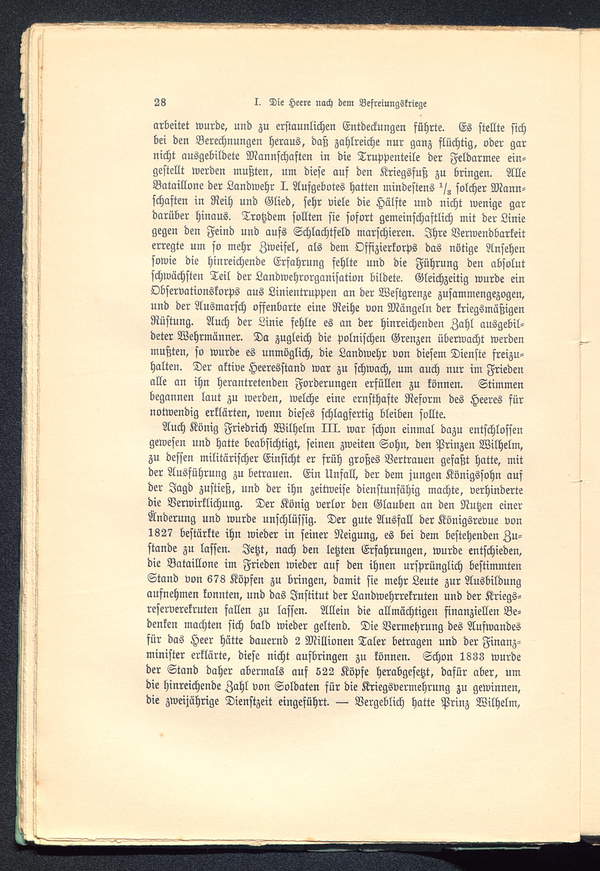 Auch König Friedrich Wilhelm HI. war schon einmal dazu entschlossengewesen und hatte beabsichtigt, seinen zweiten Sohn, den Prinzen Wilhelm,zu dessen militärischer Einsicht er früh großes Vertrauen gefaßt hatte, mitder Ausführung zu betrauen. Ein Unfall, der dem jungen Königssohn ausder Jagd zustieß, und der ihn zeitweise dienstunfähig machte, verhindertedie Verwirklichung. Der König verlor den Glauben an den Nutzen einerÄnderung und wurde unschlüssig. Der gute Ausfall der Königsrevue von1827 bestärkte ihn wieder in seiner Neigung, es bei dem bestehenden Zu-stande zu lassen. Jetzt, nach den letzten Erfahrungen, wurde entschieden,die Bataillone im Frieden wieder auf den ihnen ursprünglich bestimmtenStand von 673 Köpfen zu bringen, damit sie mehr Leute zur Ausbildungaufnehmen konnten, und das Institut der Landwehrrekruten und der Kriegs-reserverekruten fallen zu lassen. Allein die allmächtigen finanziellen Be-denken machten sich bald wieder geltend. Die Vermehrung des Aufwandesfür das Heer hätte dauernd 2 Millionen Taler betragen und der Finanz-minister erklärte, diese nicht aufbringen zu können. Schon 1833 wurdeder Stand daher abermals auf 522 Köpfe herabgesetzt, dafür aber, umdie hinreichende Zahl von Soldaten für die Kriegsvermehrung zu gewinnen,die zweijährige Dienstzeit eingeführt. — Vergeblich hatte Prinz Wilhelm,