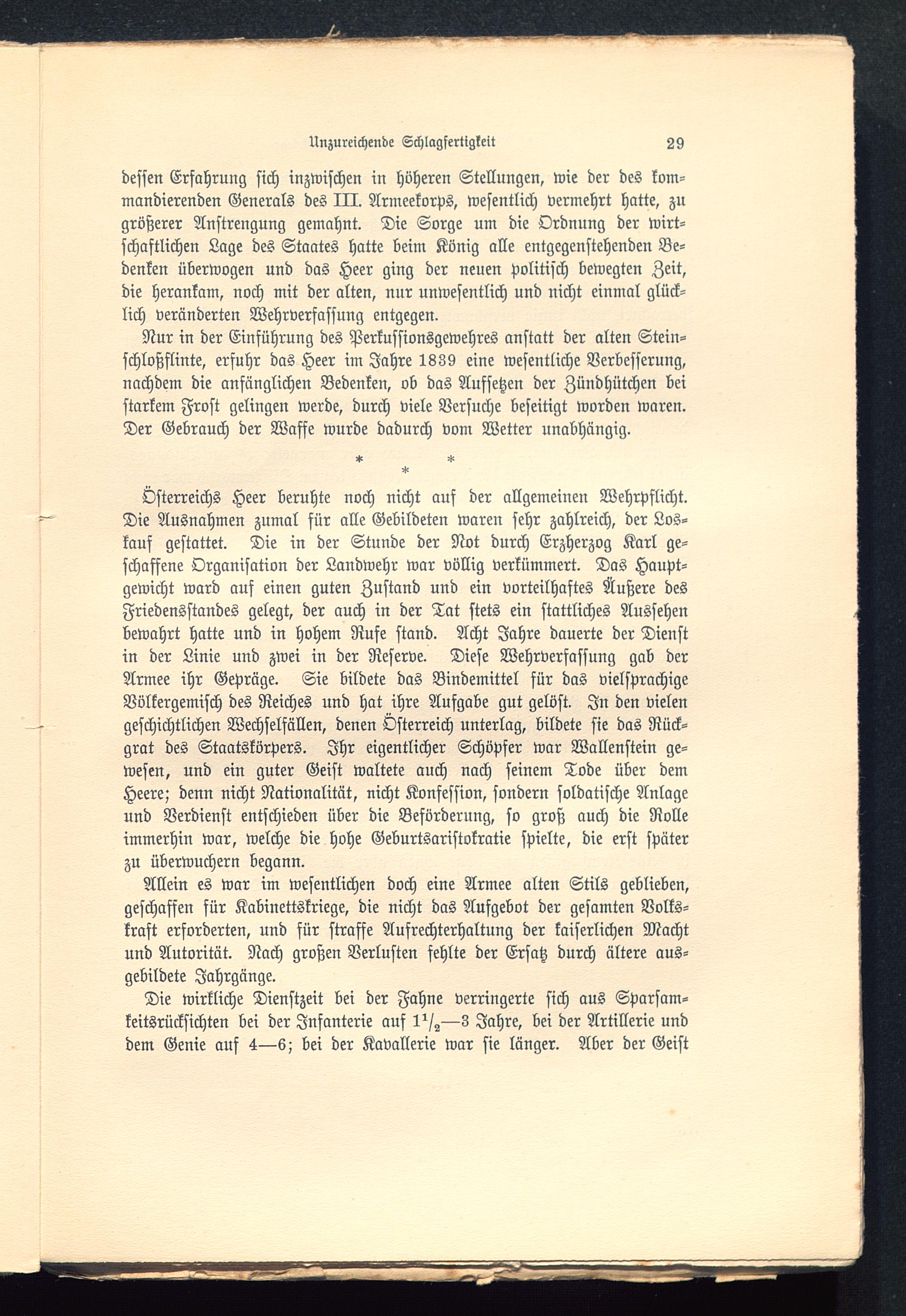 Österreichs Heer beruhte noch nicht auf der allgemeinen Wehrpflicht.Die Ausnahmen zumal für alle Gebildeten waren sehr zahlreich, der Los-kauf gestattet. Die in der Stunde der Not durch Erzherzog Karl ge-schaffene Organisation der Landwehr war völlig verkümmert. Das Haupt-gewicht ward auf einen guten Zustand und ein vorteilhaftes Äußere desFriedensstandes gelegt, der auch in der Tat stets ein stattliches Aussehenbewahrt hatte und in hohem Rufe stand. Acht Jahre dauerte der Dienstin der Linie und zwei in der Reserve. Diese Wehrverfassung gab derArmee ihr Gepräge. Sie bildete das Bindemittel für das vielsprachigeVölkergemisch des Reiches und hat ihre Aufgabe gut gelöst. In den vielengeschichtlichen Wechselfällen, denen Österreich unterlag, bildete sie das Rück-grat des Staatskörpers. Ihr eigentlicher Schöpfer war Wallenstein ge-wesen, und ein guter Geist waltete auch nach seinem Tode über demHeere; denn nicht Nationalität, nicht Konfession, sondern soldatische Anlageund Verdienst entschieden über die Beförderung, so groß auch die Rolleimmerhin war, welche die hohe Geburtsaristokratie spielte, die erst späterzu überwuchern begann.
