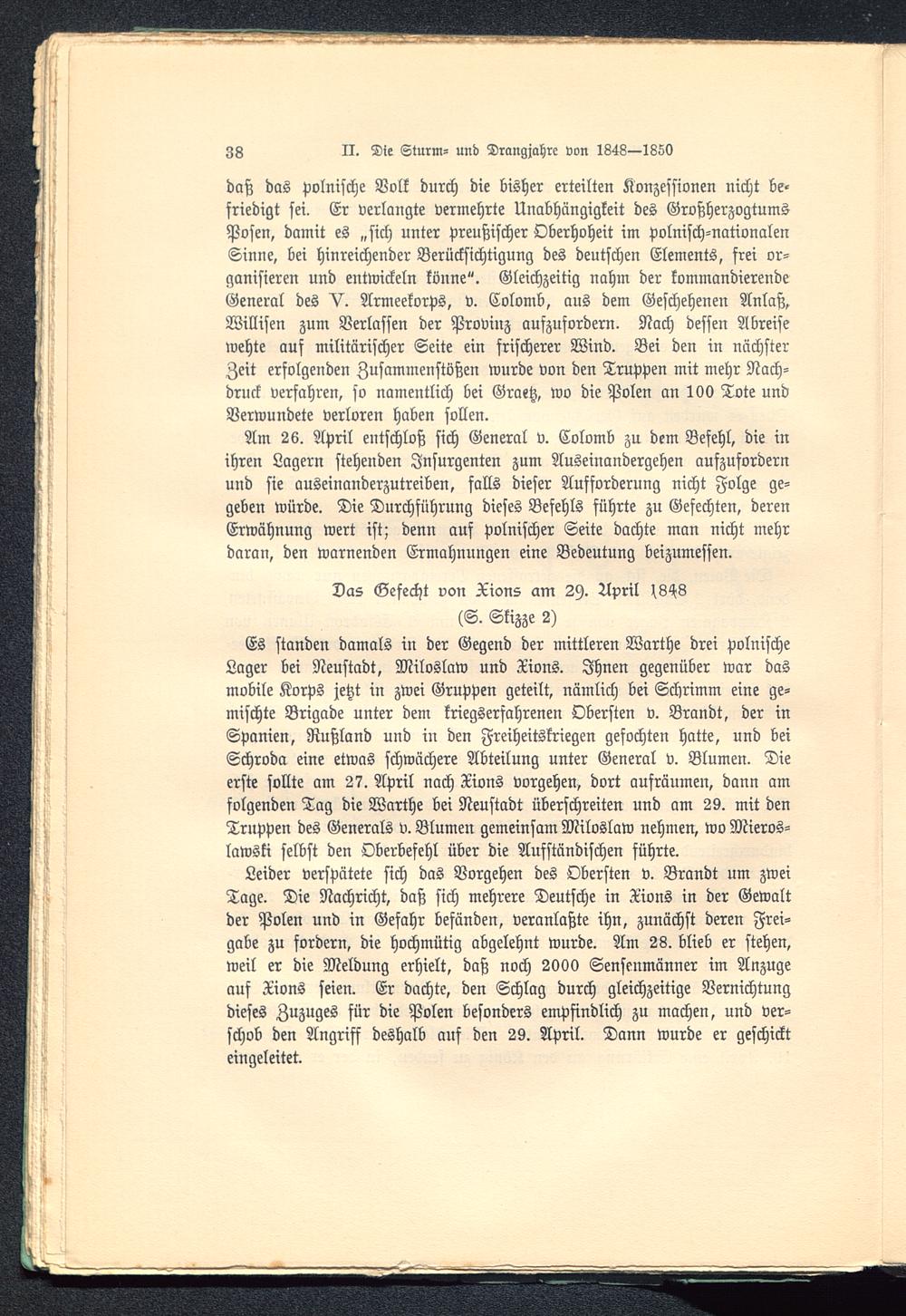 Am 26. April entschloß sich General v. Colomb zu dem Befehl, die inihren Lagern stehenden Insurgenten zum Auseinandergehen aufzufordernund sie auseinanderzutreiben, falls dieser Ausforderung nicht Folge ge-geben würde. Die Durchführung dieses Befehls führte zu Gefechten, derenErwähnung wert ist; denn auf polnischer Seite dachte man nicht mehrdaran, den warnenden Ermahnungen eine Bedeutung beizumessen.