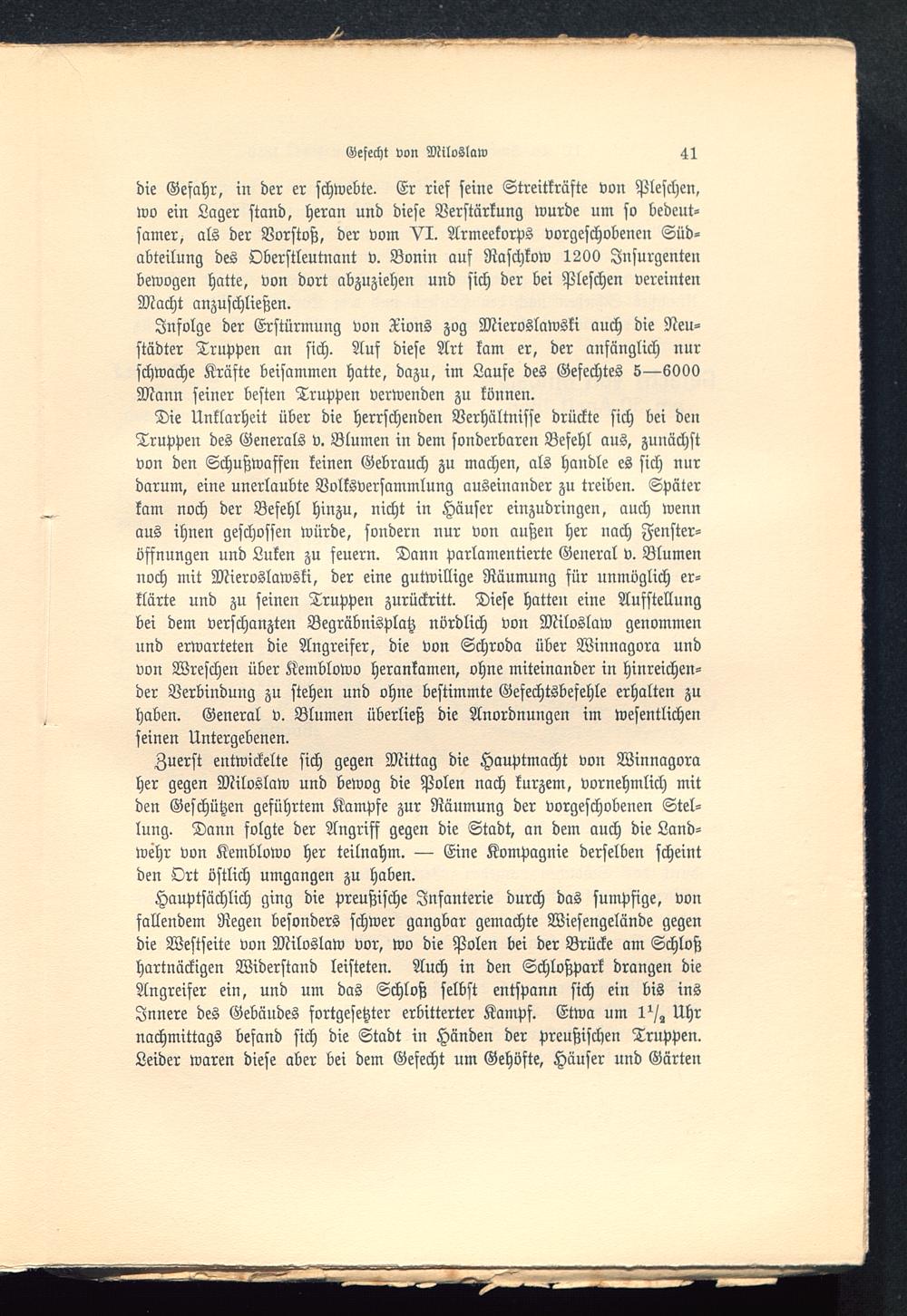 Zuerst entwickelte sich gegen Mittag die Hauptmacht von Winnagoraher gegen Miloslaw und bewog die Polen nach kurzem, vornehmlich mitden Geschützen geführtem Kampfe zur Räumung der vorgeschobenen Stel-lung. Dann folgte der Angriff gegen die Stadt, an dem auch die Land-wehr von Kemblowo her teilnahm. — Eine Kompagnie derselben scheintden Ort östlich umgangen zu haben.