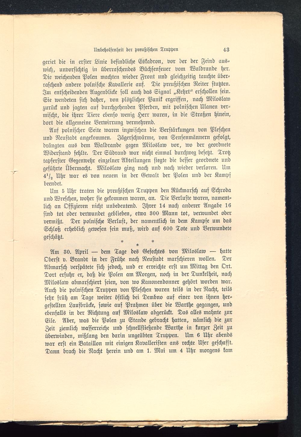 Um 5 Uhr traten die preußischen Truppen den Rückmarsch auf Schroda und Wreschen, woher sie gekommen waren, an. Die Verluste waren, nament-lich an Offizieren nicht unbedeutend. Ihrer 14 nach anderer Angabe 16sind tot oder verwundet geblieben, etwa 300 Mann tot, verwundet odervermißt. Der polnische Verlust, der namentlich in dem Kampfe um dasSchloß erheblich gewesen sein muß, wird auf 600 Tote und Verwundetegeschätzt.