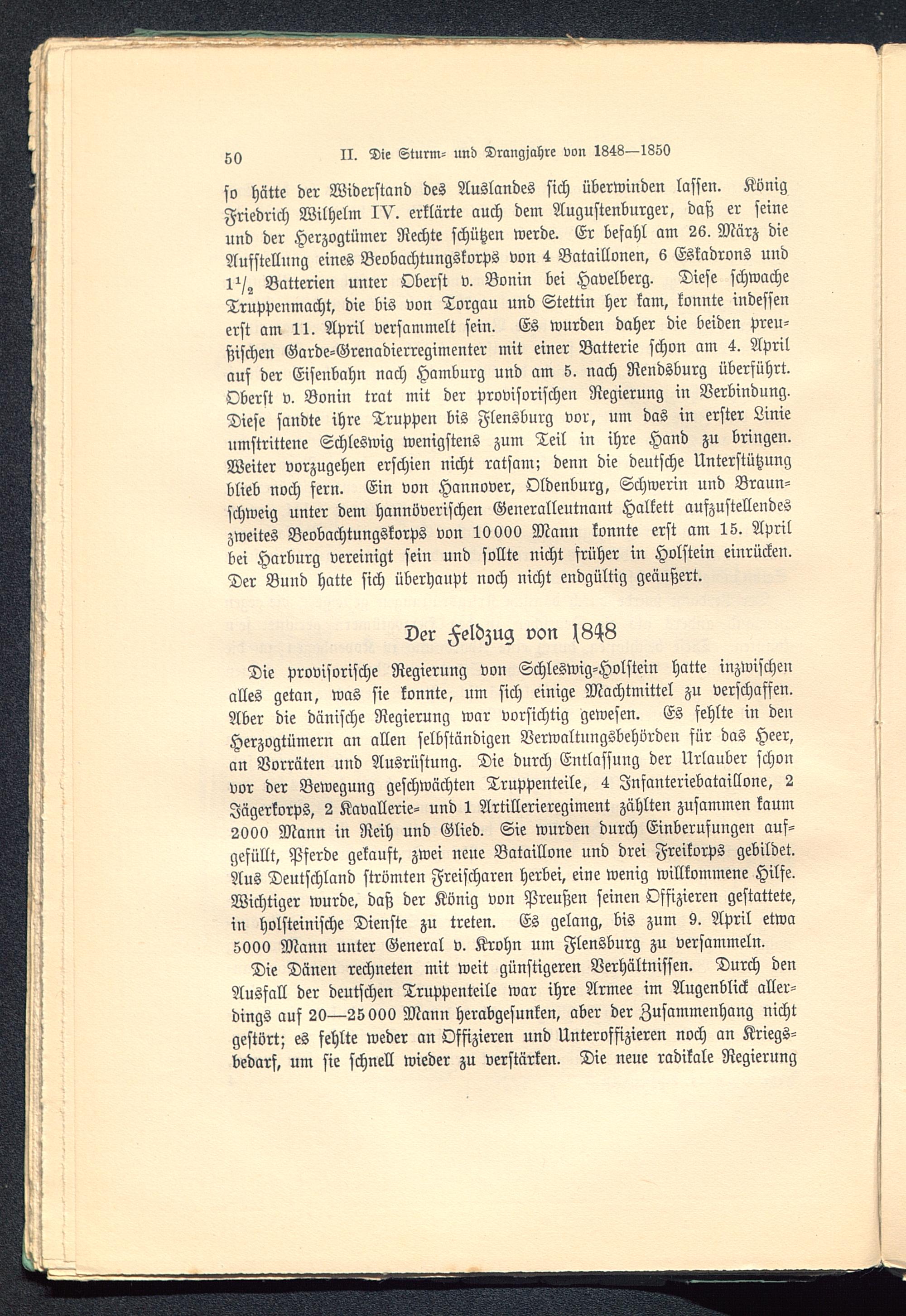so hätte der Widerstand des Auslandes sich überwinden lassen. KönigFriedrich Wilhelm IV. erklärte auch dem Augustenburger, daß er seineund der Herzogtümer Rechte schützen werde. Er befahl am 26. März dieAufstellung eines Beobachtungskorps von 4 Bataillonen, 6 Eskadrons uud1^/2 Batterien unter Oberst v. Bonin bei Havelberg . Diese schwacheTruppenmacht, die bis von Torgau und Stettin her kam, konnte indessenerst am 11. April versammelt sein. Es wurden daher die beiden preu-ßischen Garde-Grenadierregimenter mit einer Batterie schon am 4. Aprilauf der Eisenbahn nach Hamburg und am 5. nach Rendsburg überführt.Oberst v. Bonin trat mit der provisorischen Regierung in Verbindung.Diese sandte ihre Truppen bis Flensburg vor, um das in erster Linieumstrittene Schleswig wenigstens zum Teil in ihre Hand zu bringen.Weiter vorzugehen erschien nicht ratsam; denn die deutsche Unterstützungblieb noch fern. Ein von Hannover, Oldenburg, Schwerin und Braun-schweig unter dem hannoverischen Generalleutnant Halkett aufzustellendeszweites Beobachtungskorps von 10000 Mann konnte erst am IS. Aprilbei Harburg vereinigt sein und sollte nicht früher in Holstein einrücken.Der Bund hatte sich überhaupt noch nicht endgültig geäußert.