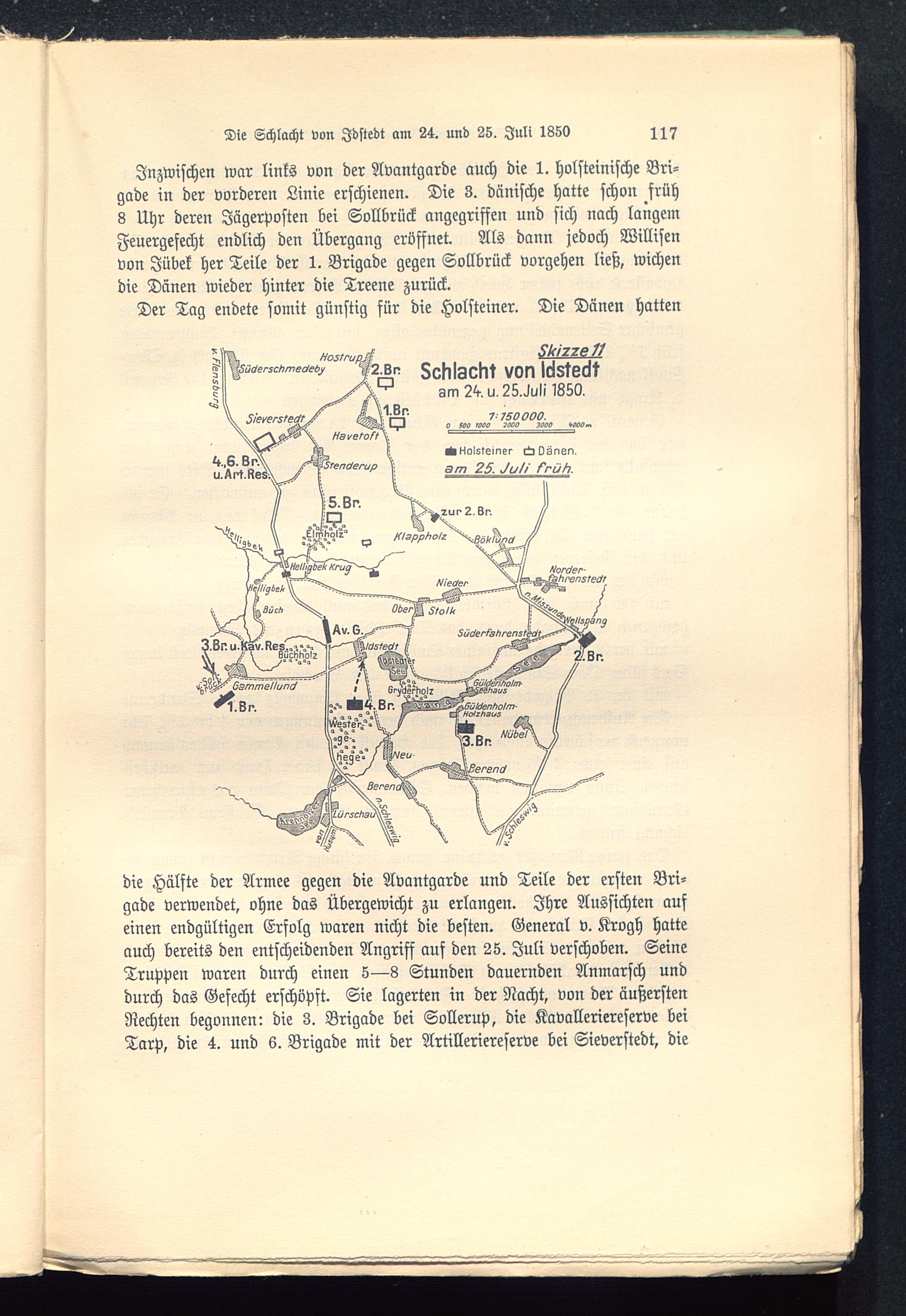 Inzwischen war links von der Avantgarde auch die 1. holsteinische Bri-gade in der vorderen Linie erschienen. Die 3. dänische hatte schon früh8 Uhr deren Jägerposten bei Sollbrück angegriffen und sich nach langemFeuergefecht endlich den Übergang eröffnet. Als dann jedoch Willisenvon Jübek her Teile der 1. Brigade gegen Sollbrück vorgehen ließ, wichendie Dänen wieder hinter die Treene zurück.